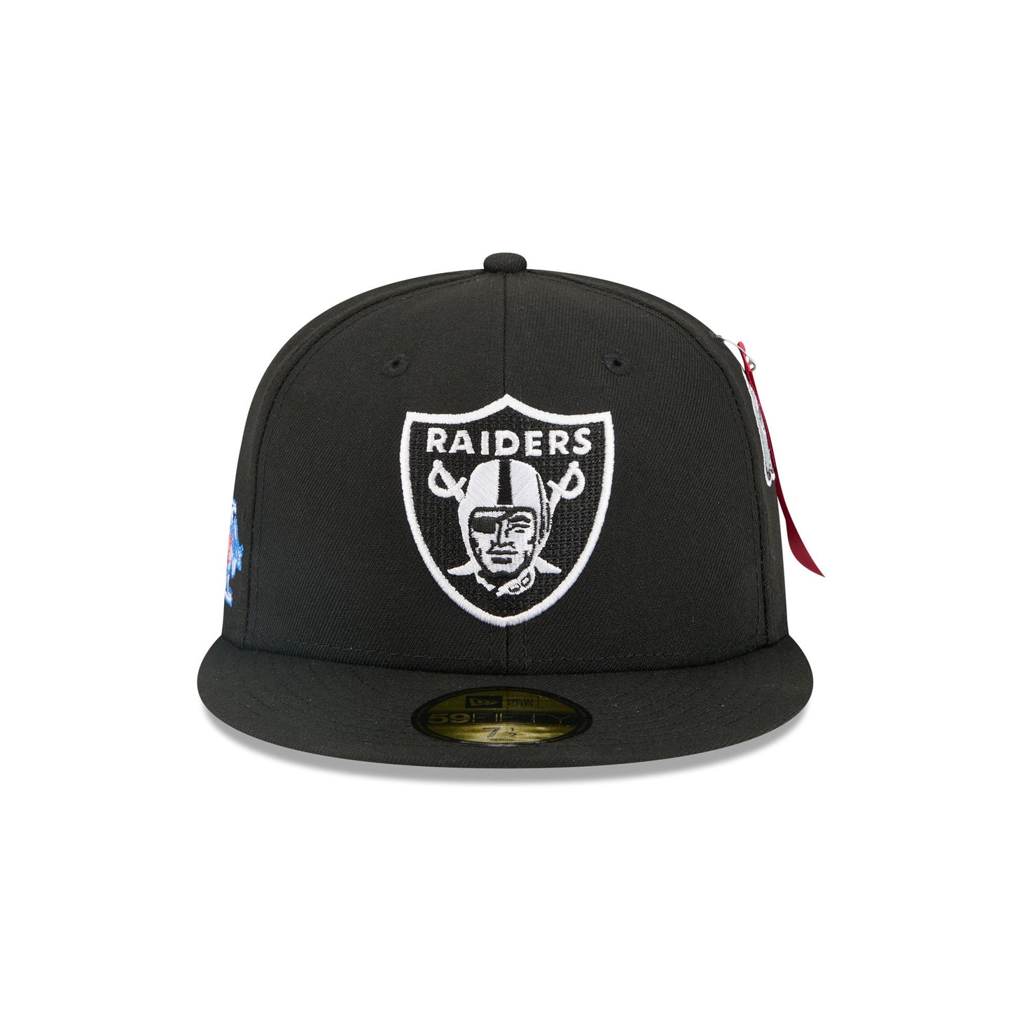 The Alpha Industries x Las Vegas Raiders Black 59FIFTY Fitted Cap features an embroidered black and white Raiders logo at the front panels with a signature Alpha Industries red ribbon and an alternate team logo at the left-wear side and a Super Bowl XVIII patch at the right-wear side. Additional details include a woven New Era Cap x Alpha Industries tag above a matching NFL Shield at the rear with an BLANK patch to the left and a team wordmark to the right.