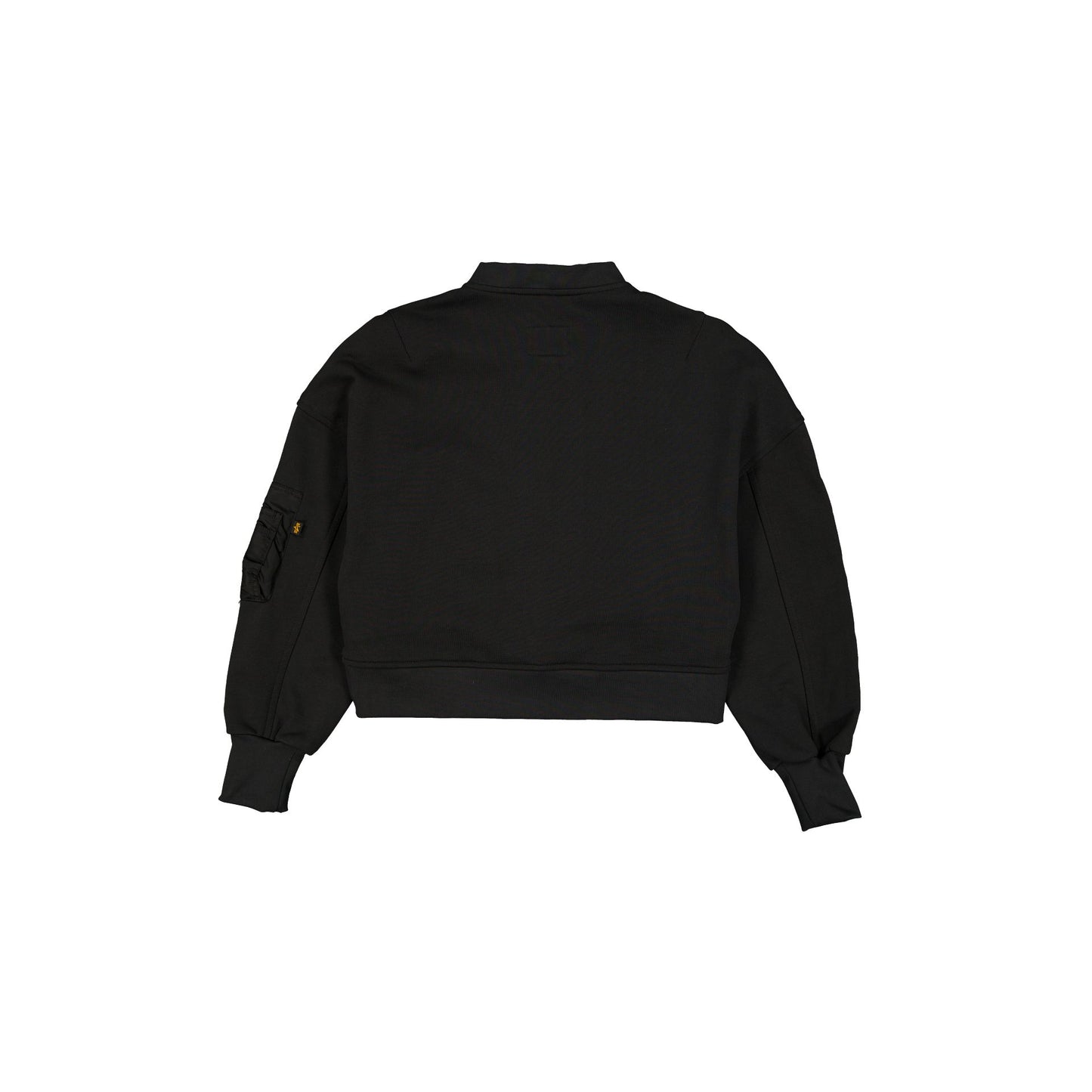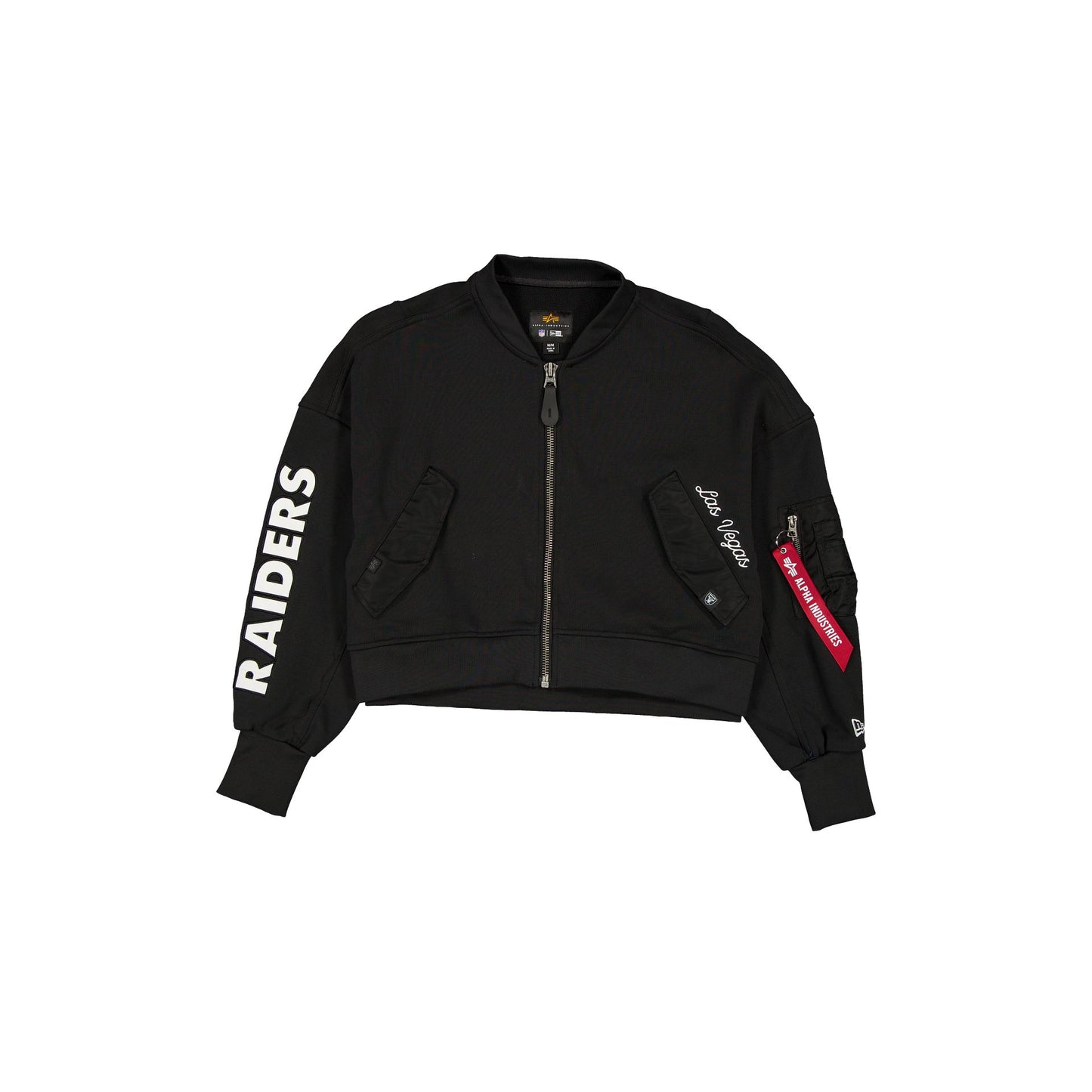 The Alpha Industries x Las Vegas Raiders Black Women's Full Zip Cropped Fleece Jacket features an embroidered Raiders wordmark and woven team logo tag at the snap button pocket with a utility pocket with the signature Alpha Industries red ribbon at the left sleeve, and a nylon applique wordmark at the right sleeve.