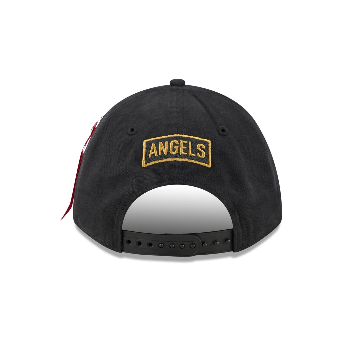 The Alpha Industries x Los Angeles Angels Black 9FORTY M-Crown A-Frame Snapback features a gold embroidered Angels logo at the front with a matching team wordmark above a snapback closure at the rear. Additional details include the signature Alpha Industries red ribbon at the left-wear side with embroidered gold leaf details at the visor and a black undervisor.