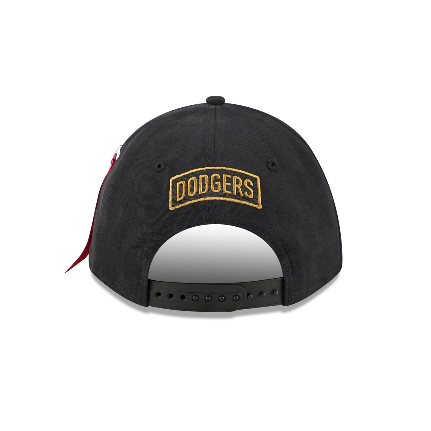 The Alpha Industries x Los Angeles Dodgers Black 9FORTY M-Crown A-Frame Snapback features a gold embroidered Dodgers logo at the front with a matching team wordmark above a snapback closure at the rear. Additional details include the signature Alpha Industries red ribbon at the left-wear side with embroidered gold leaf details at the visor and a black undervisor.