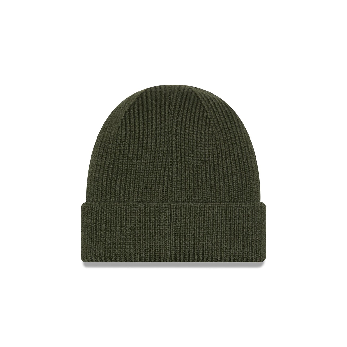 The Alpha Industries x Los Angeles Dodgers Olive Green Cuff Knit features an embroidered green and white Dodgers logo at the front with the signature Alpha Industries red ribbon at the crown and a woven New Era Cap x Alpha Industries tag at the rear.