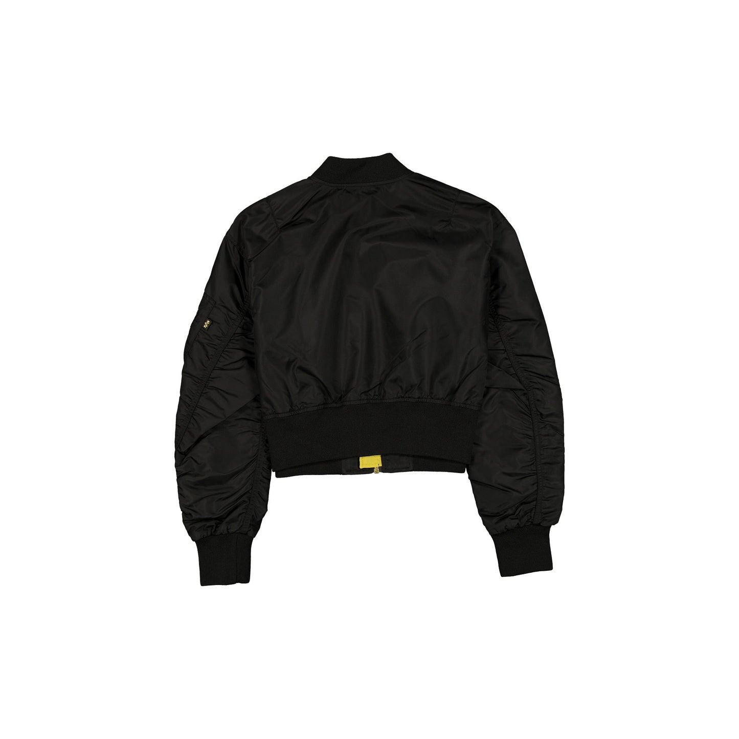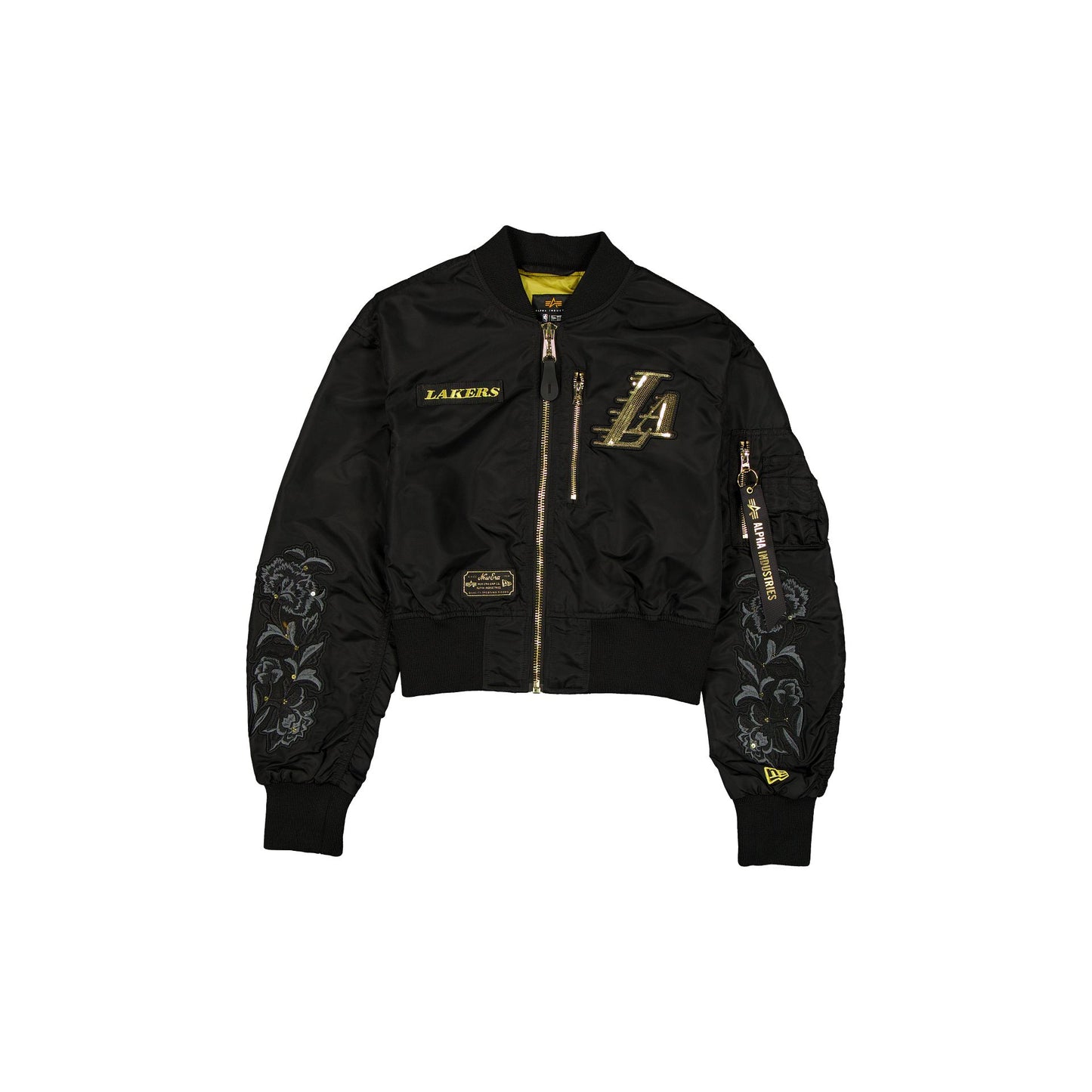 The Alpha Industries x Los Angeles Lakers Black and Gold Women's Cropped L-2B Bomber Jacket features a sequin Lakers logo patch at the left chest with an embroidered team wordmark at the right chest and a woven New Era Cap x Alpha Industries tag at the hem. Additional details include a embroidered sequin floral details at the sleeves with a utility pocket with the signature Alpha Industries red ribbon at the left sleeve.
