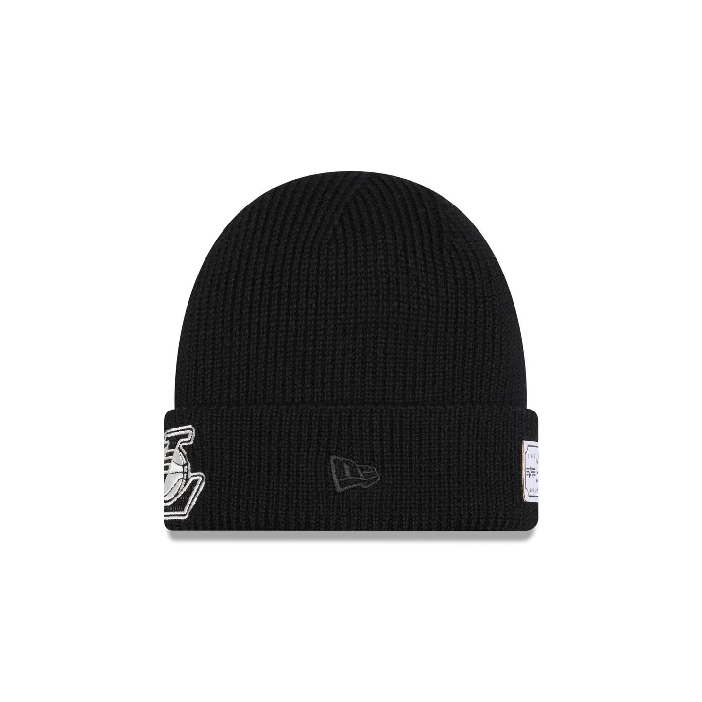 The Alpha Industries x Los Angeles Lakers Black Cuff Knit features an embroidered black and white Lakers logo at the front with the signature Alpha Industries red ribbon at the crown and a woven New Era Cap x Alpha Industries tag at the rear.