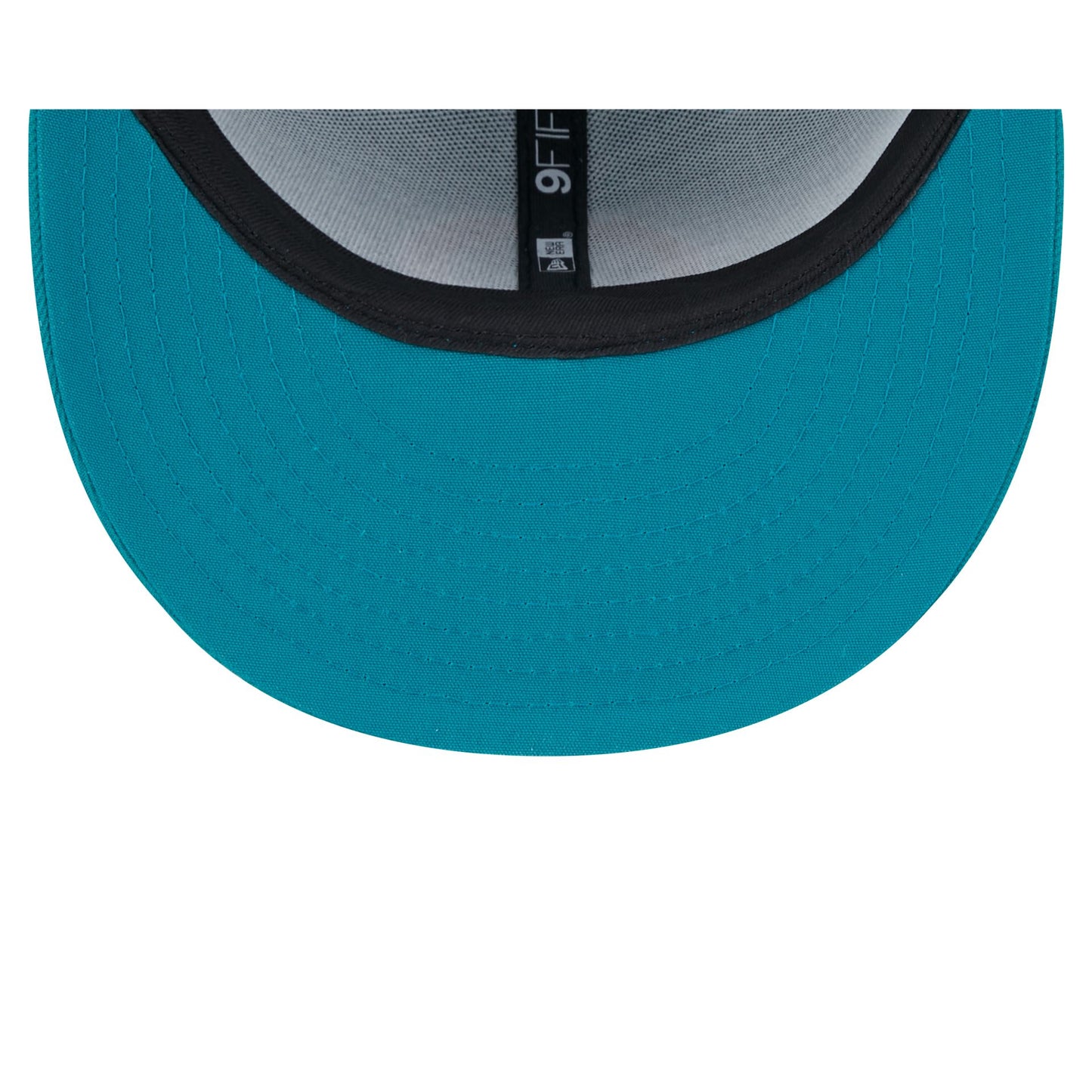 The Alpha Industries x Miami Dolphins Historic Teal 9FIFTY Snapback features a chainstitch embroidered Dolphins logo at the front panels with a matching team logo at the right-wear side, a signature Alpha Industries red ribbon at the left-wear side, and a snapback closure at the rear.