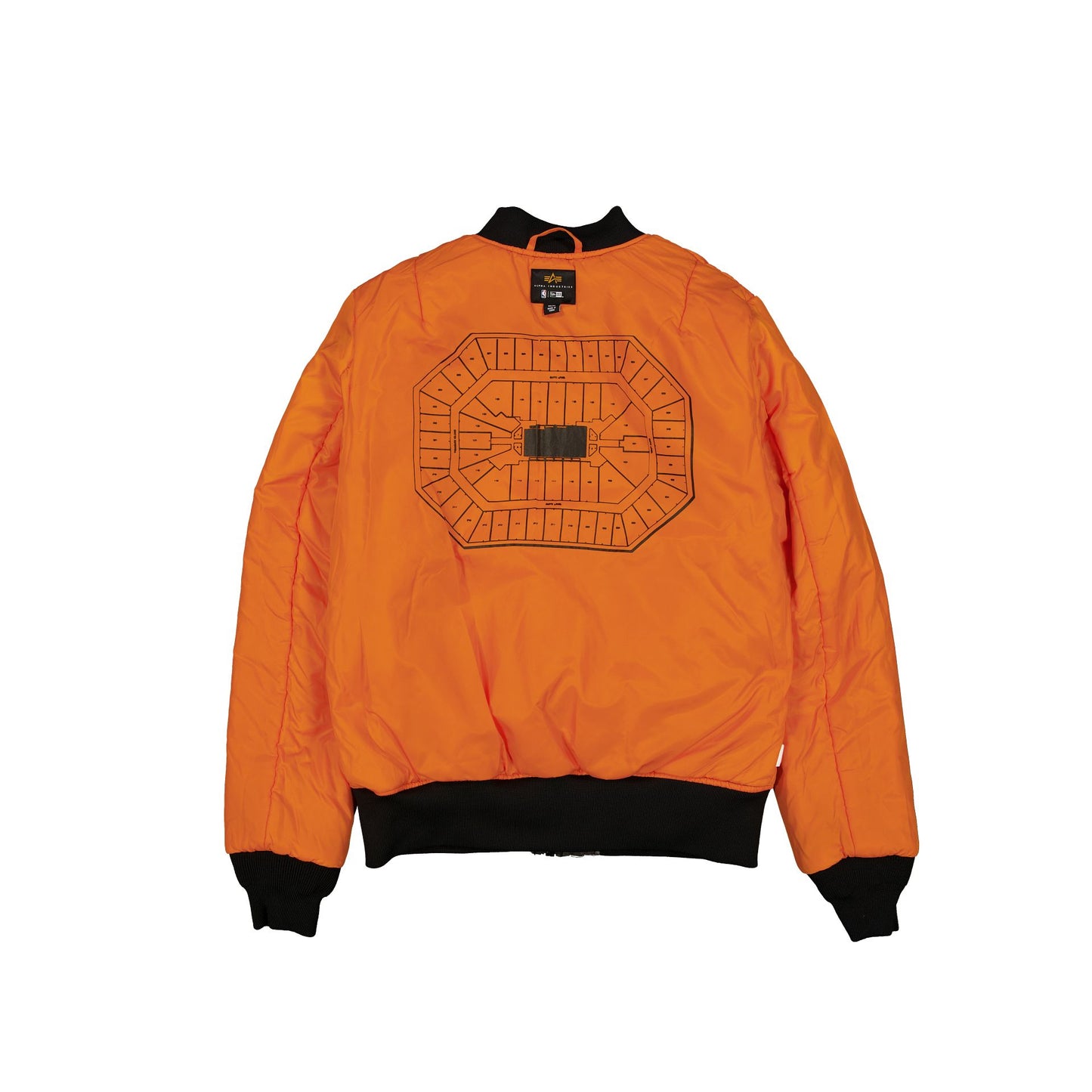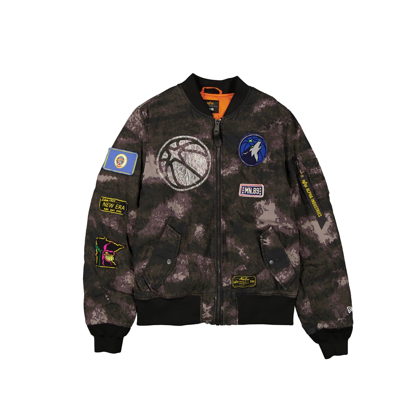 The Alpha Industries x Minnesota Timberwolves Black Camo MA-1 Bomber Jacket features a screen-printed Timberwolves logo at the right chest with a matching team graphic at the rear, a full-zip closure at the front, and a woven New Era Cap x Alpha Industries tag at the hem. Additional details include frayed edge alternate team logos at the left chest with a Minnesota flag, New Era Cap patch, and Minnesota flower patch at the right sleeve. Further details include the Target Center arena blueprint at the interior lining.