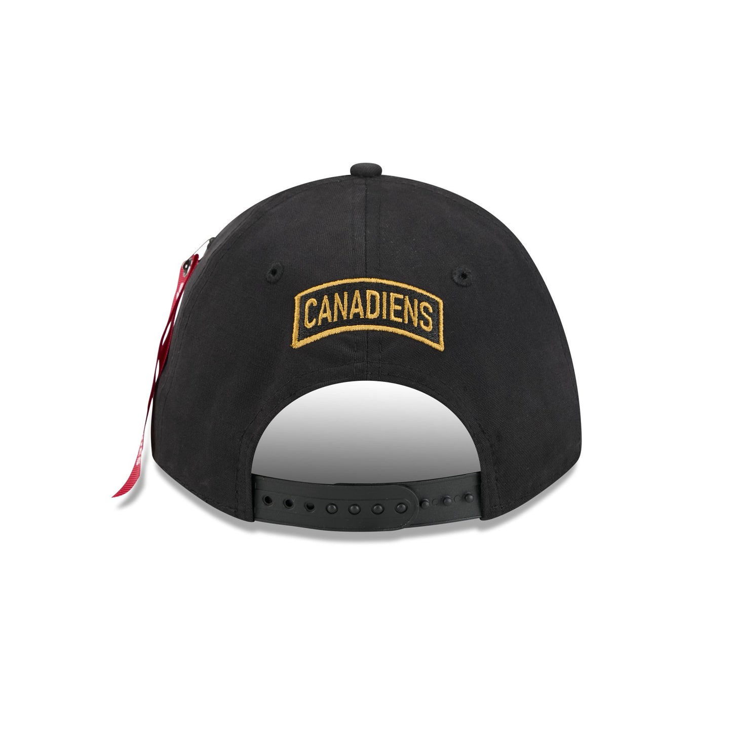 The Alpha Industries x Montreal Canadiens Black 9FORTY M-Crown A-Frame Snapback features a gold embroidered Canadiens logo at the front with a matching team wordmark above a snapback closure at the rear. Additional details include the signature Alpha Industries red ribbon at the left-wear side with embroidered gold leaf details at the visor and a black undervisor.