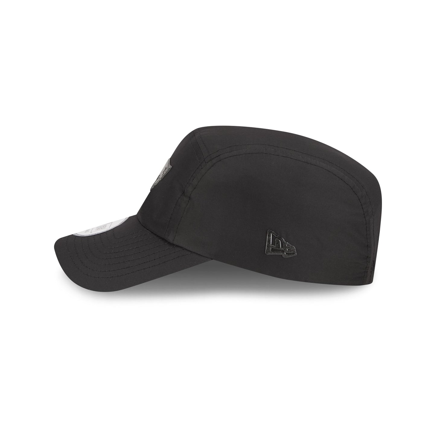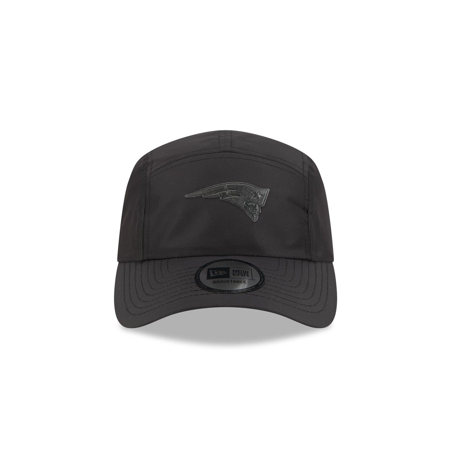 The Alpha Industries x New England Patriots Black Runner Adjustable Cap features a silicone Patriots logo at the front with a woven New Era Cap x Alpha Industries tag above an adjustable Alpha Industries red ribbon strapback closure at the rear.