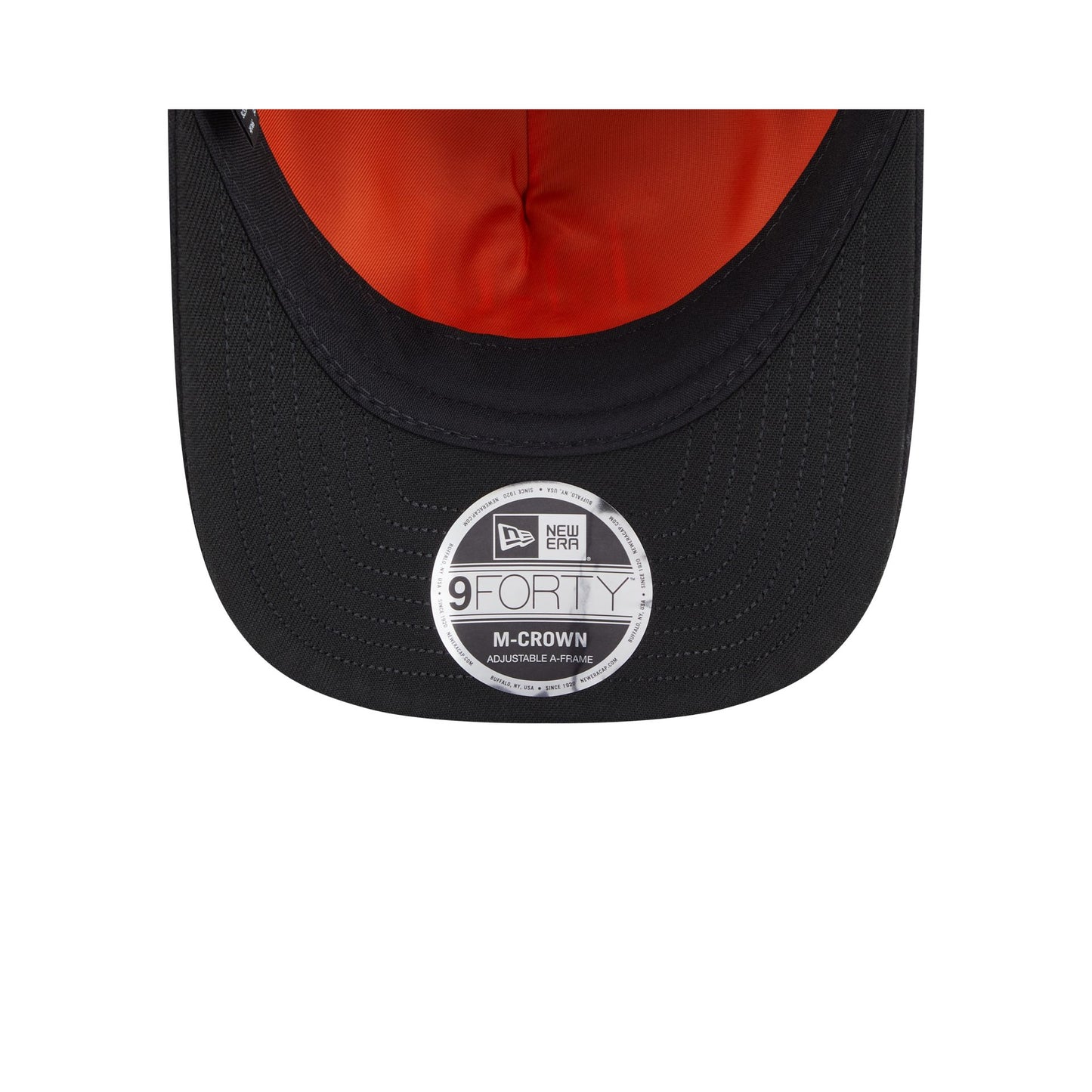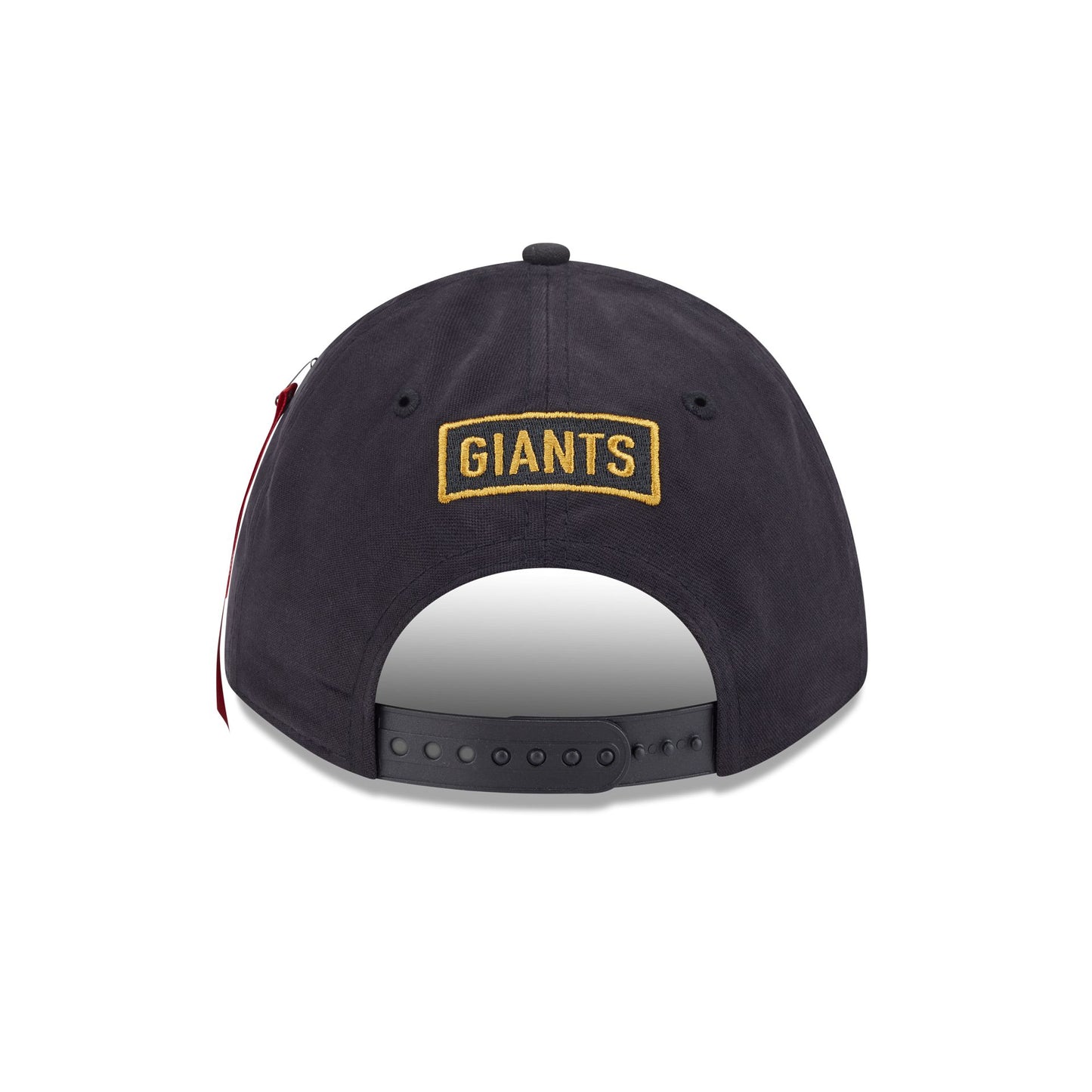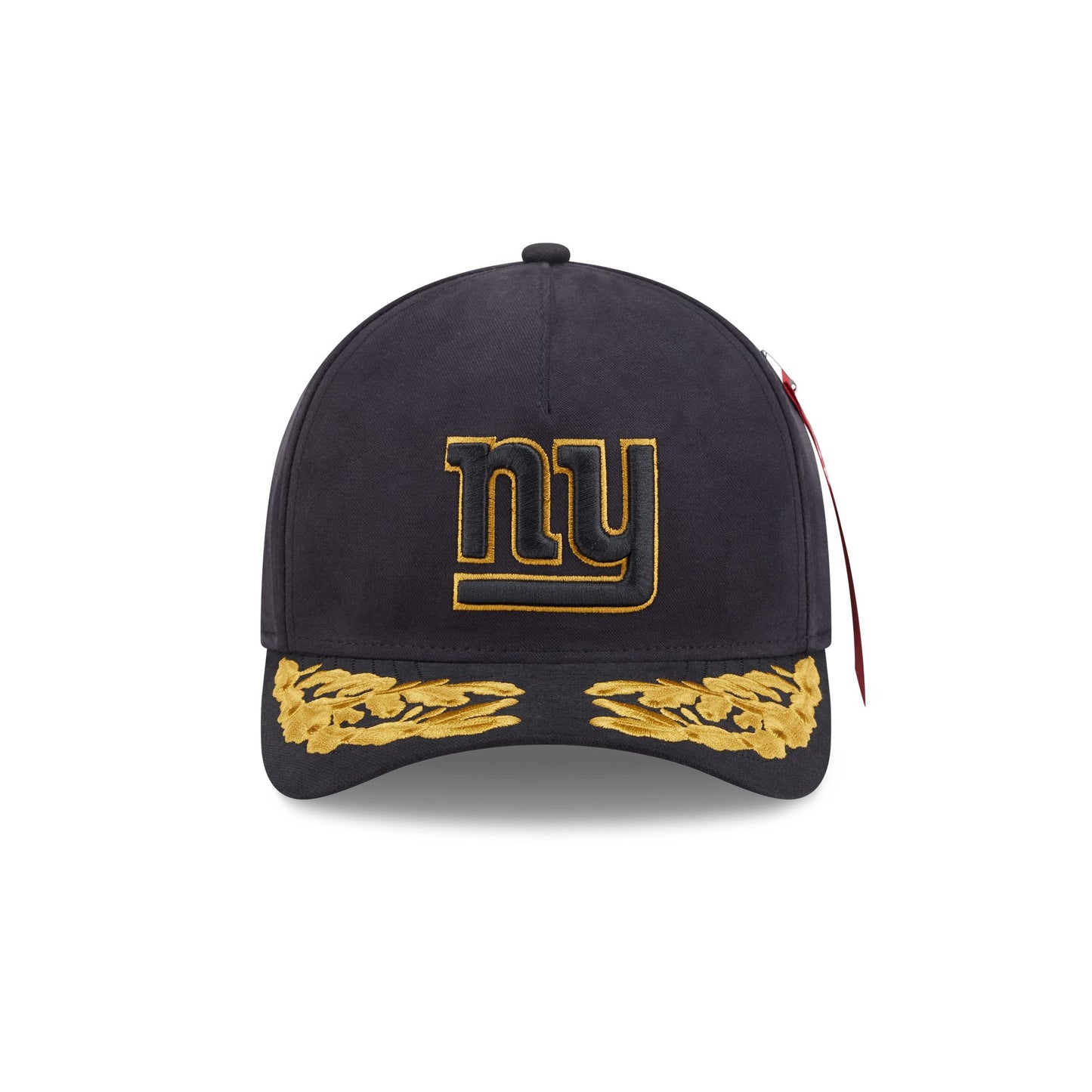 The Alpha Industries x New York Giants Black 9FORTY M-Crown A-Frame Snapback features a gold embroidered Giants logo at the front with a matching team wordmark above a snapback closure at the rear. Additional details include the signature Alpha Industries red ribbon at the left-wear side with embroidered gold leaf details at the visor and a black undervisor.