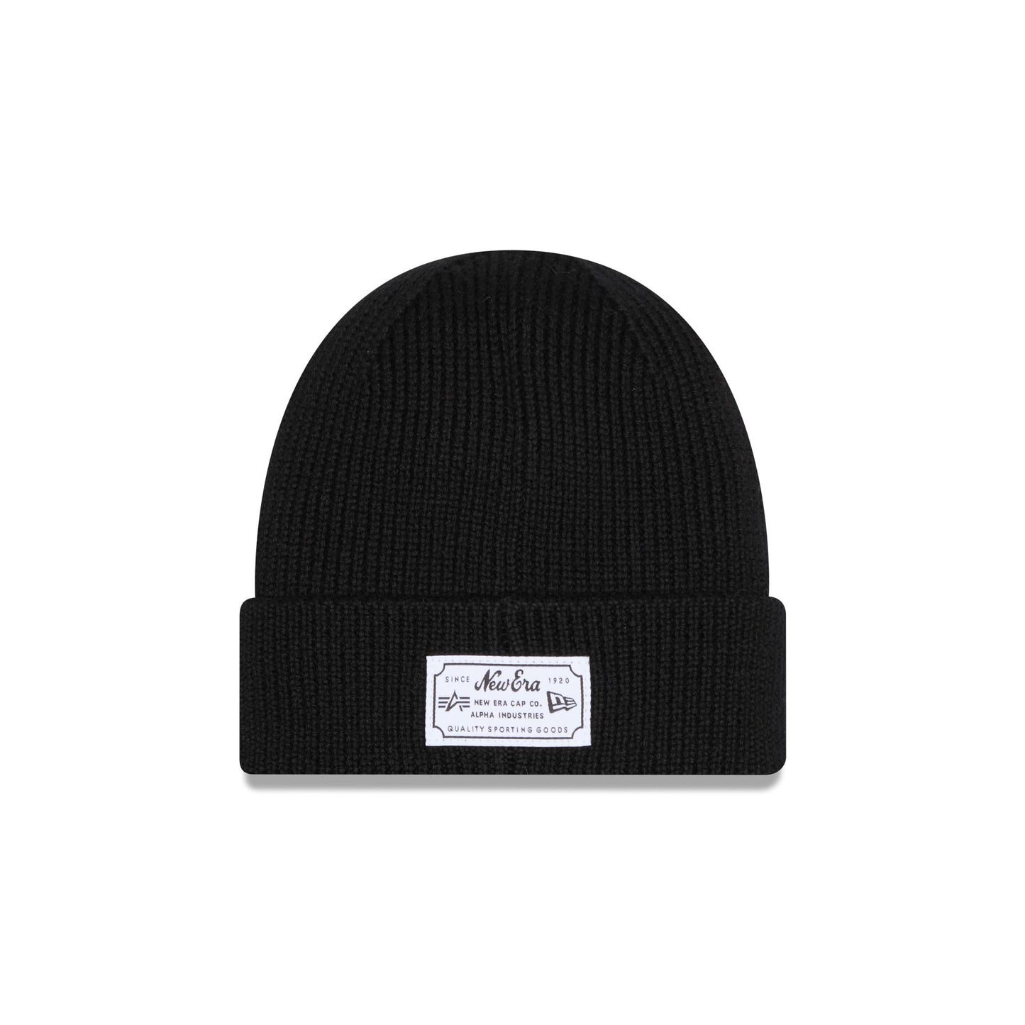 The Alpha Industries x New York Jets Black Cuff Knit features an embroidered black and white Jets logo at the front with the signature Alpha Industries red ribbon at the crown and a woven New Era Cap x Alpha Industries tag at the rear.
