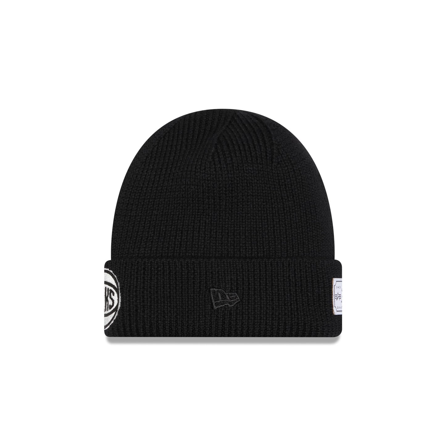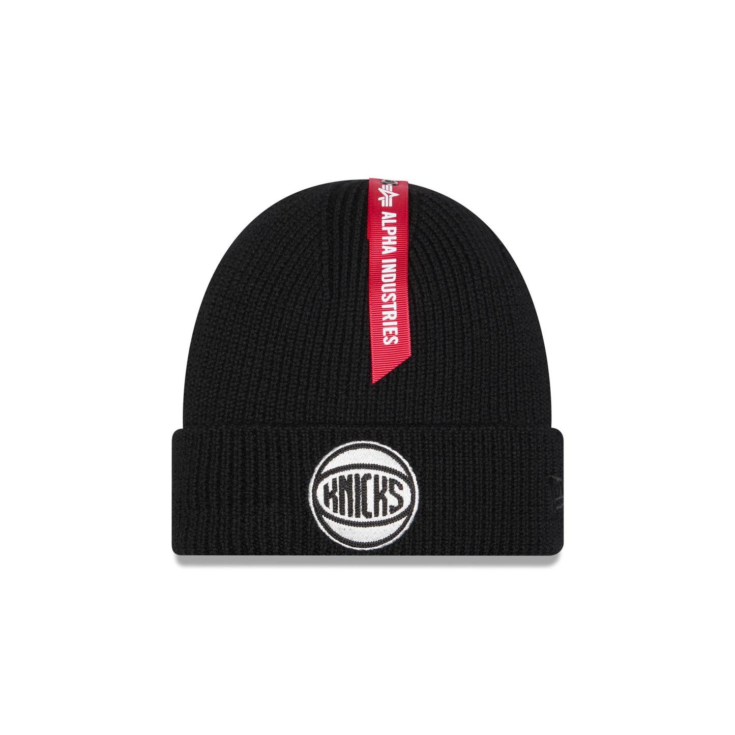 The Alpha Industries x New York Knicks Black Cuff Knit features an embroidered black and white Knicks logo at the front with the signature Alpha Industries red ribbon at the crown and a woven New Era Cap x Alpha Industries tag at the rear.