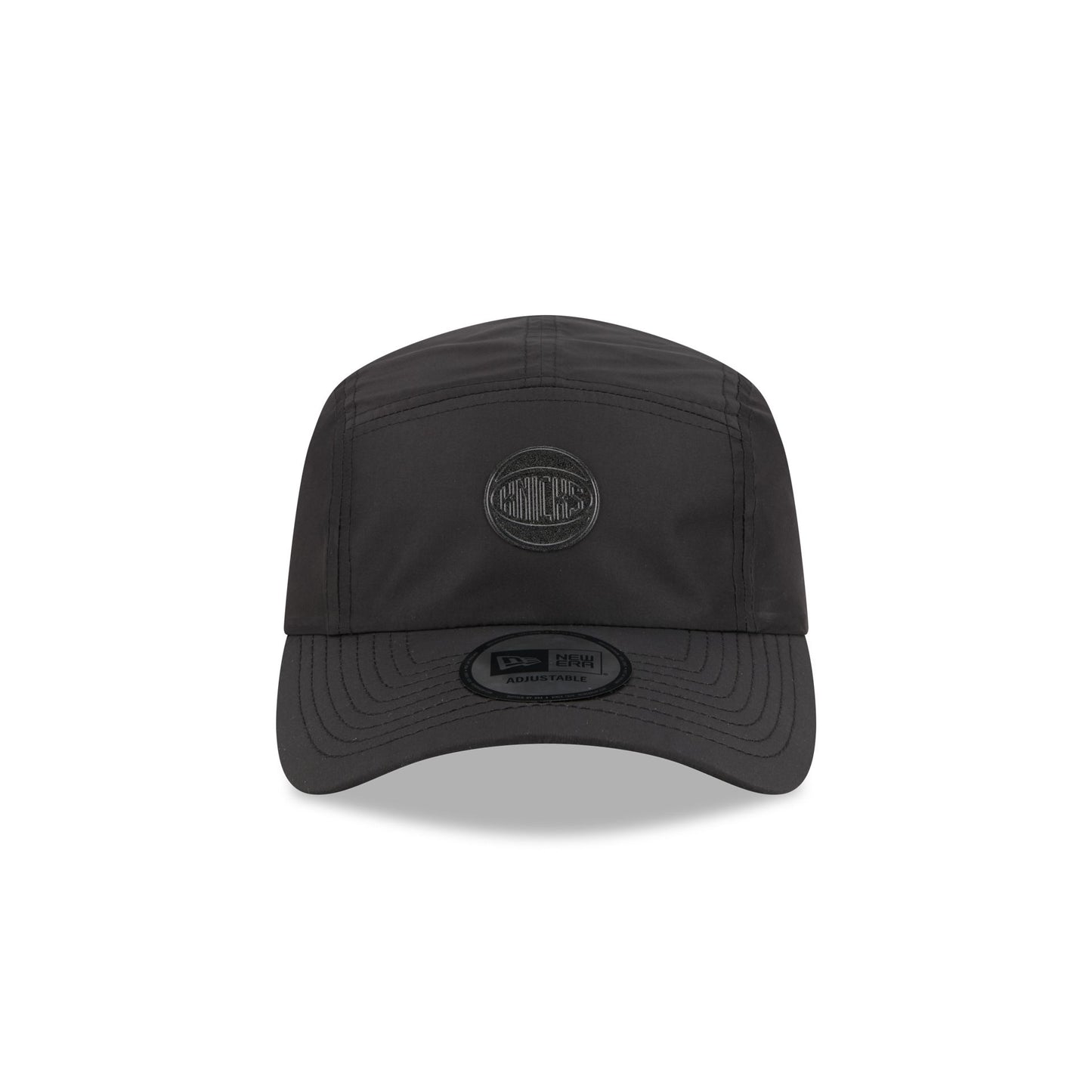 The Alpha Industries x New York Knicks Black Runner Adjustable Cap features a silicone Knicks logo at the front with a woven New Era Cap x Alpha Industries tag above an adjustable Alpha Industries red ribbon strapback closure at the rear.