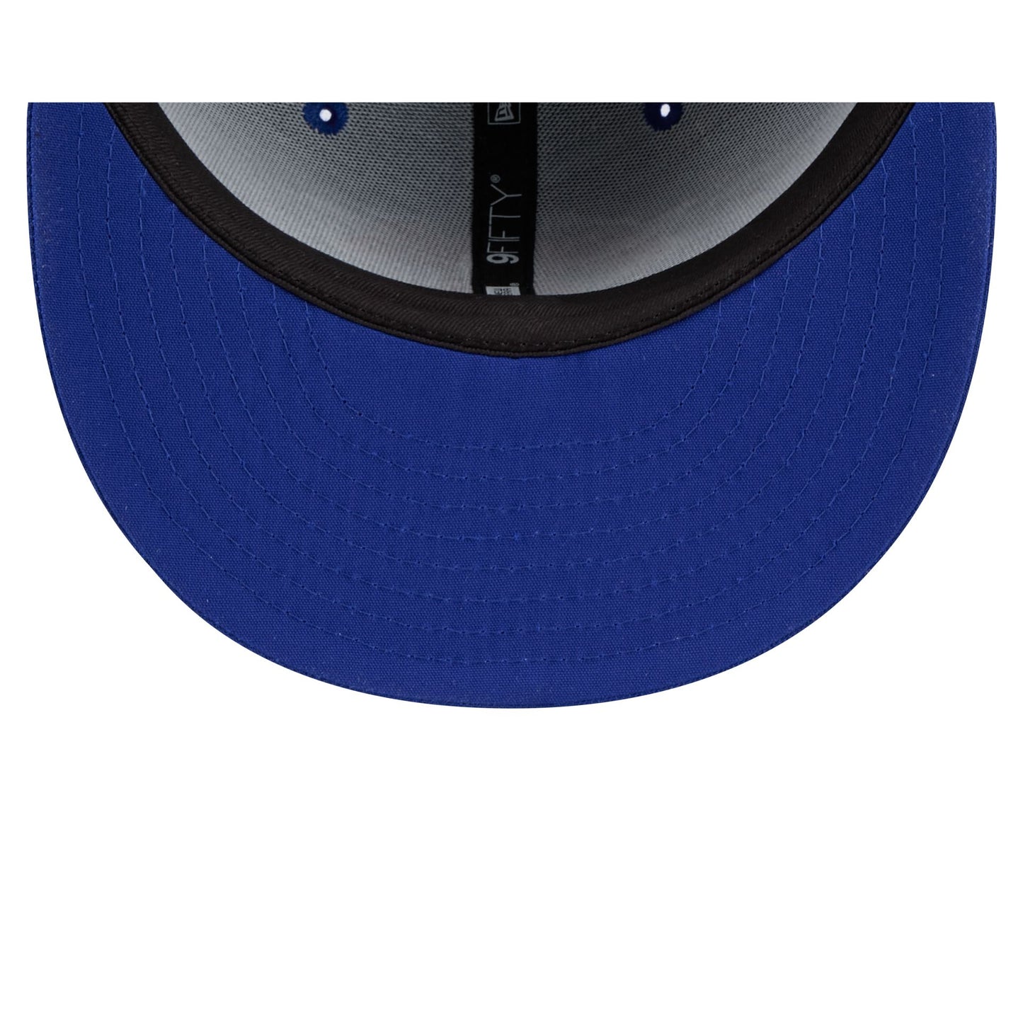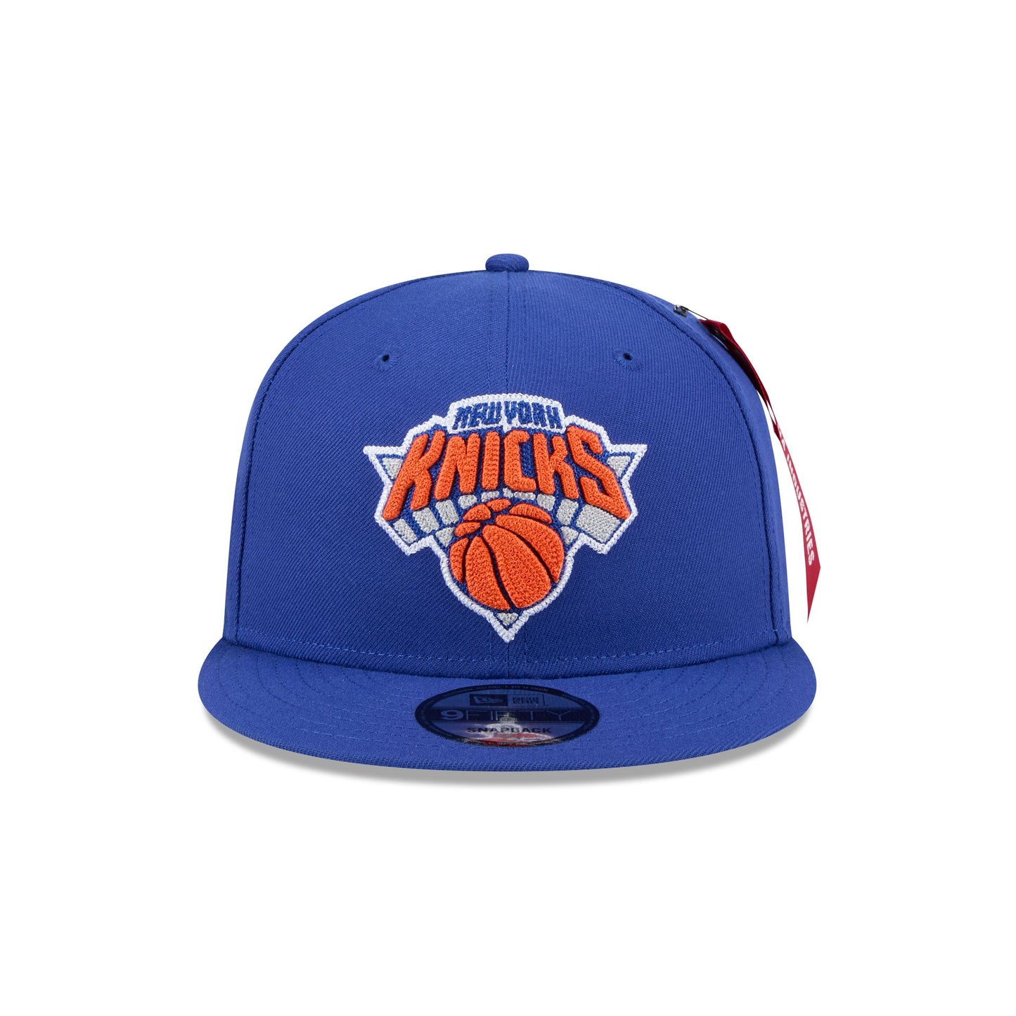 The Alpha Industries x New York Knicks Blue 9FIFTY Snapback features a chainstitch embroidered Knicks logo at the front panels with a matching NBA Logoman at the right-wear side, a signature Alpha Industries red ribbon at the left-wear side, and a snapback closure at the rear.