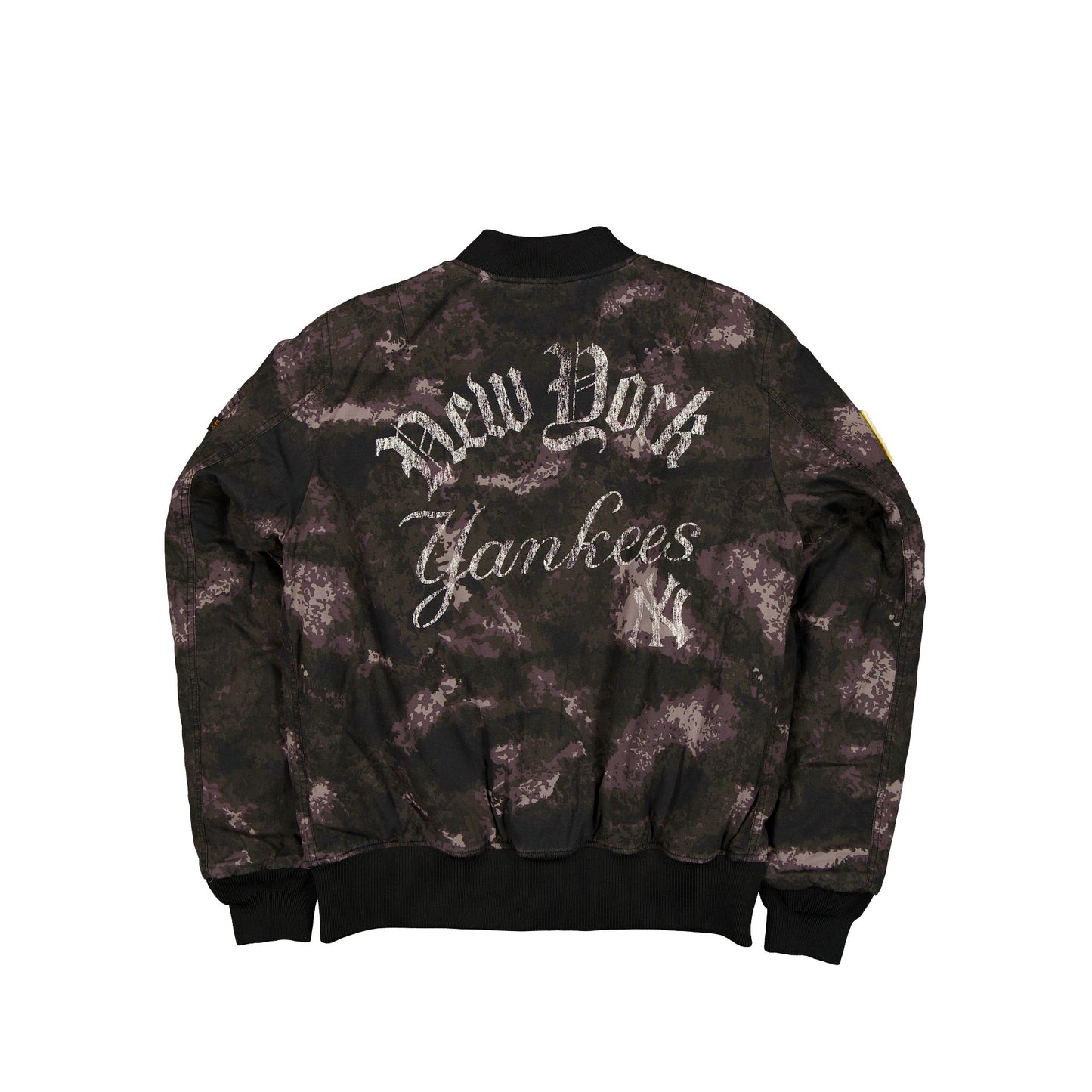 The Alpha Industries x New York Yankees Black Camo MA-1 Bomber Jacket features a screen-printed Yankees logo at the right chest with a matching team graphic at the rear, a full-zip closure at the front, and a woven New Era Cap x Alpha Industries tag at the hem. Additional details include frayed edge alternate team logos at the left chest with New York City flag, New Era Cap patch, and New York State flower patch at the right sleeve. Further details include the Yankee Stadium ballpark blueprint at the interior lining.