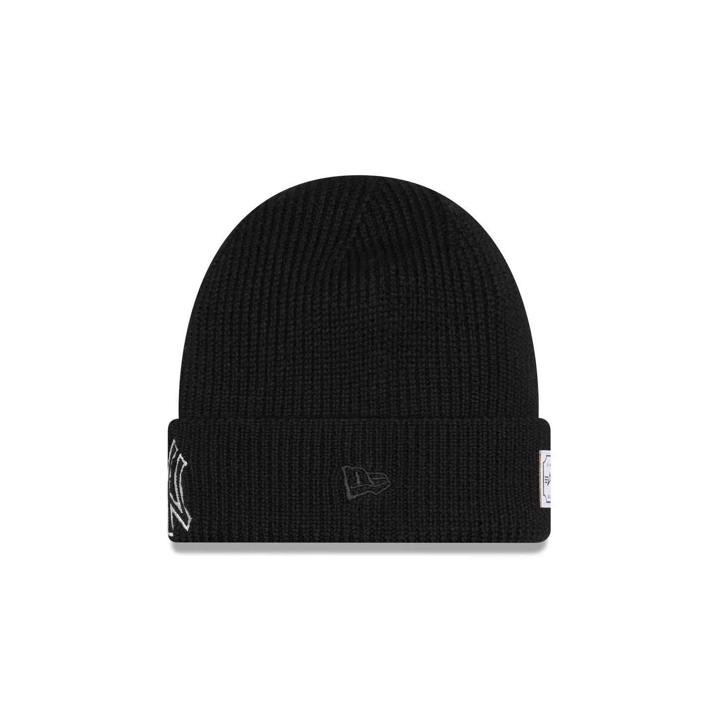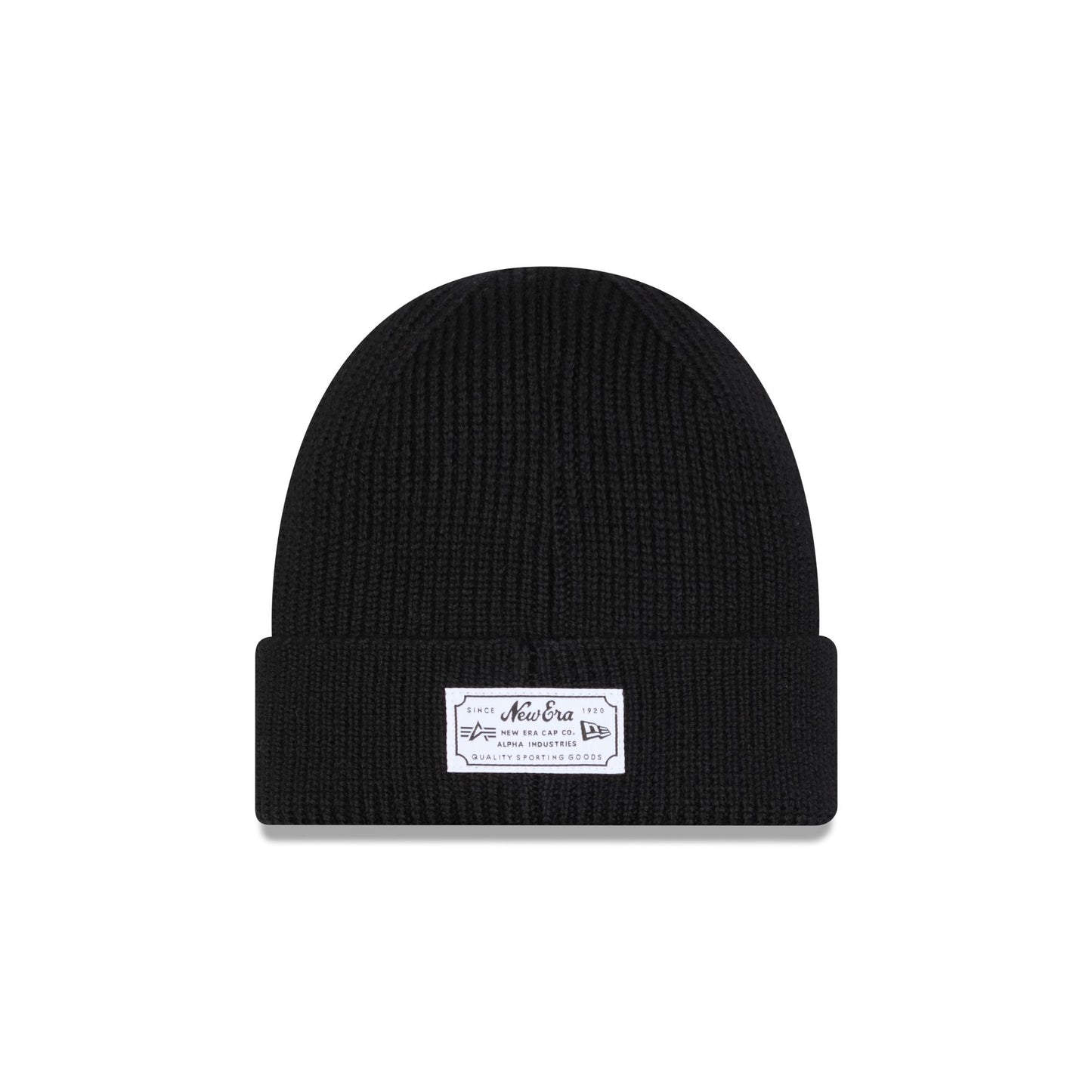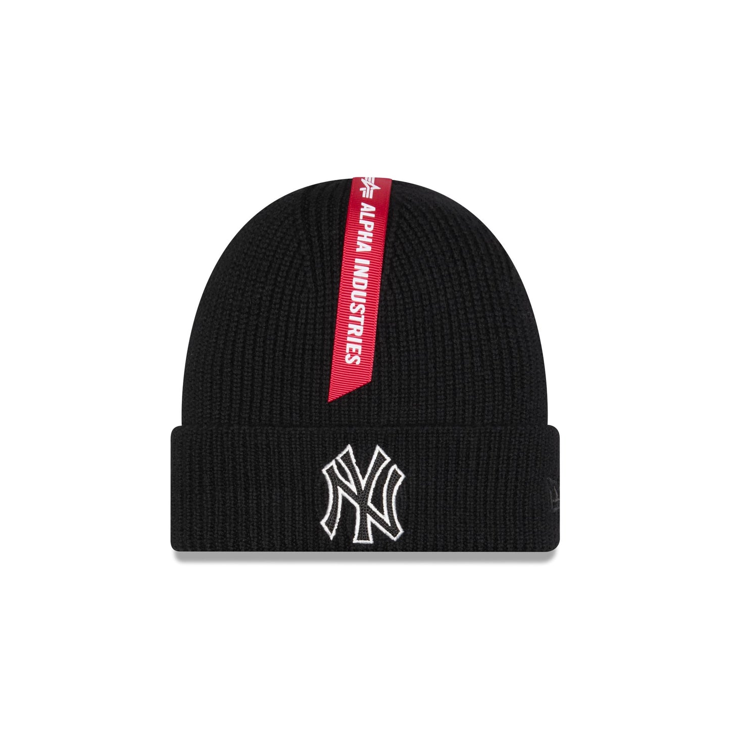The Alpha Industries x New York Yankees Black Cuff Knit features an embroidered black and white Yankees logo at the front with the signature Alpha Industries red ribbon at the crown and a woven New Era Cap x Alpha Industries tag at the rear.