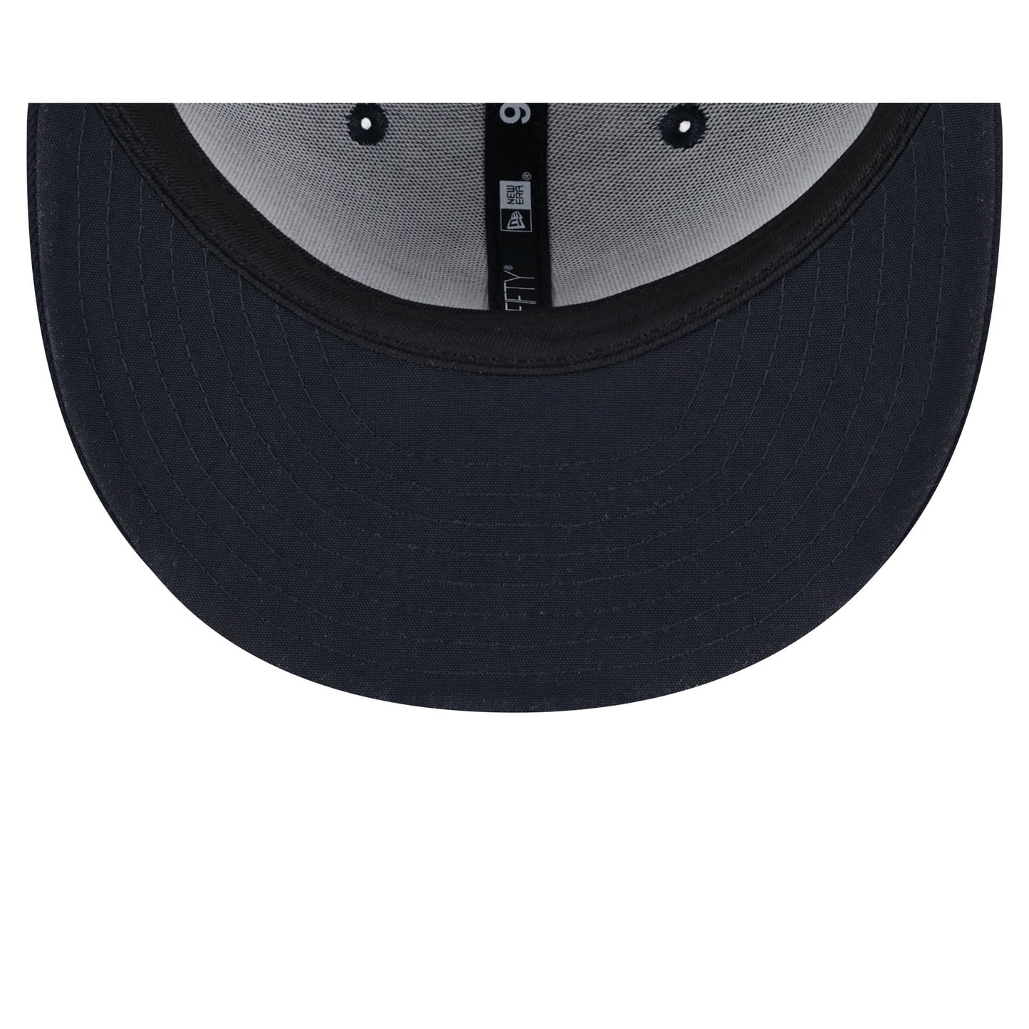 The Alpha Industries x New York Yankees Navy 9FIFTY Snapback features a chainstitch embroidered Yankees logo at the front panels with an alternate team logo at the right-wear side, a signature Alpha Industries red ribbon at the left-wear side, and a snapback closure at the rear.