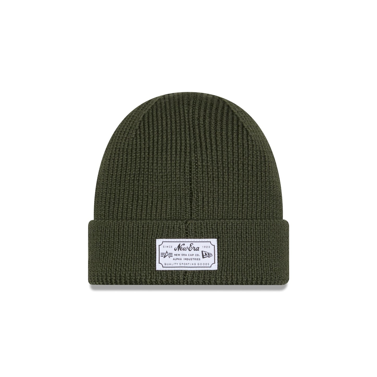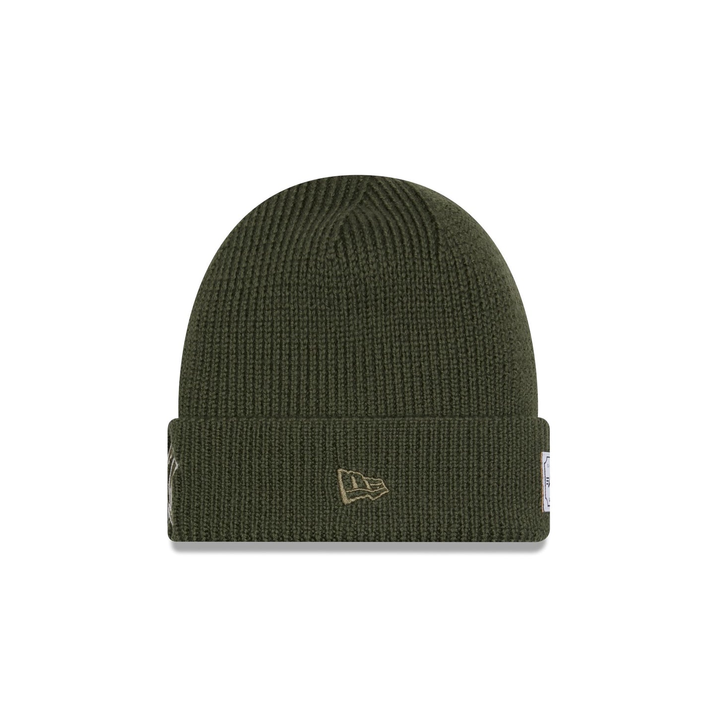 The Alpha Industries x New York Yankees Olive Green Cuff Knit features an embroidered green and white Yankees logo at the front with the signature Alpha Industries red ribbon at the crown and a woven New Era Cap x Alpha Industries tag at the rear.