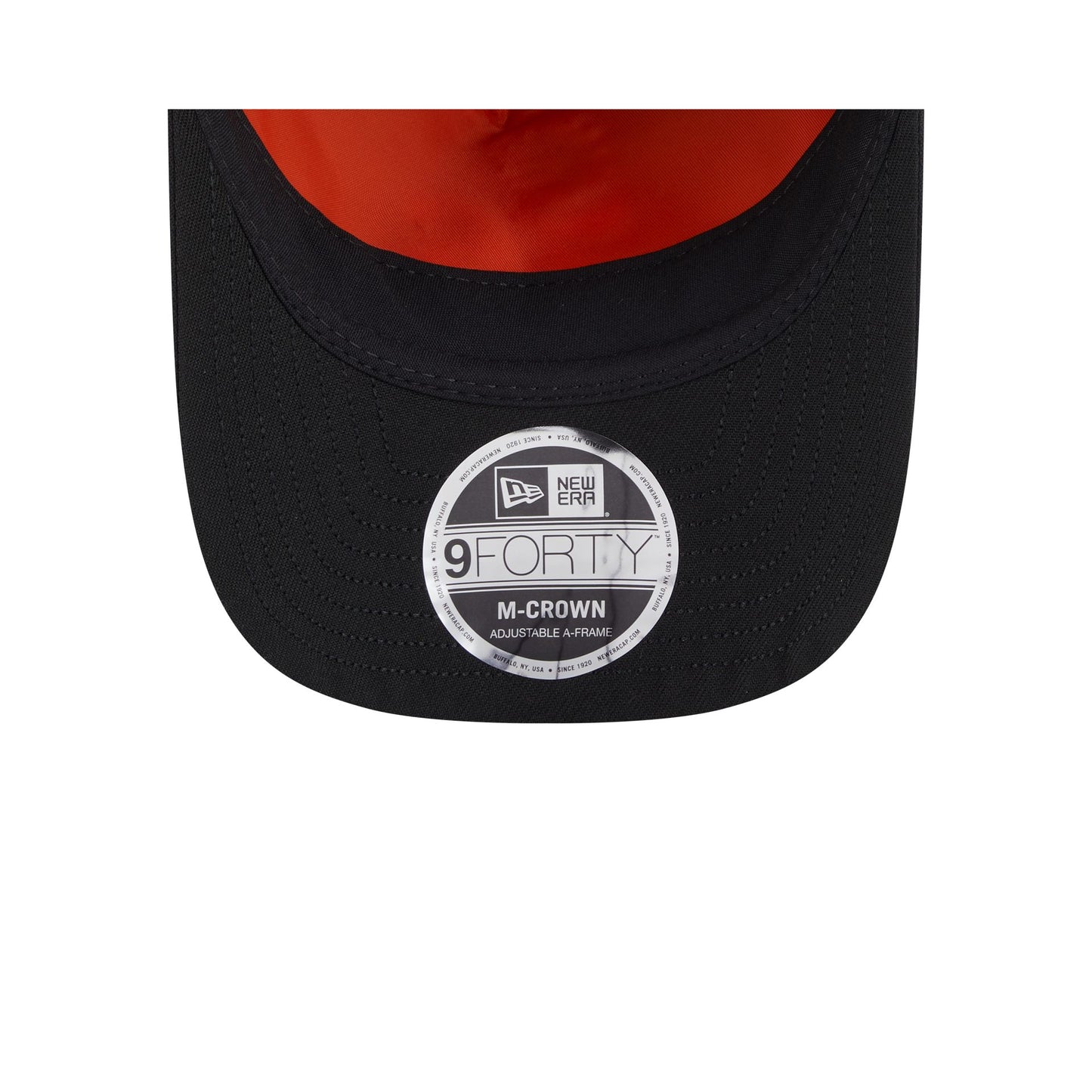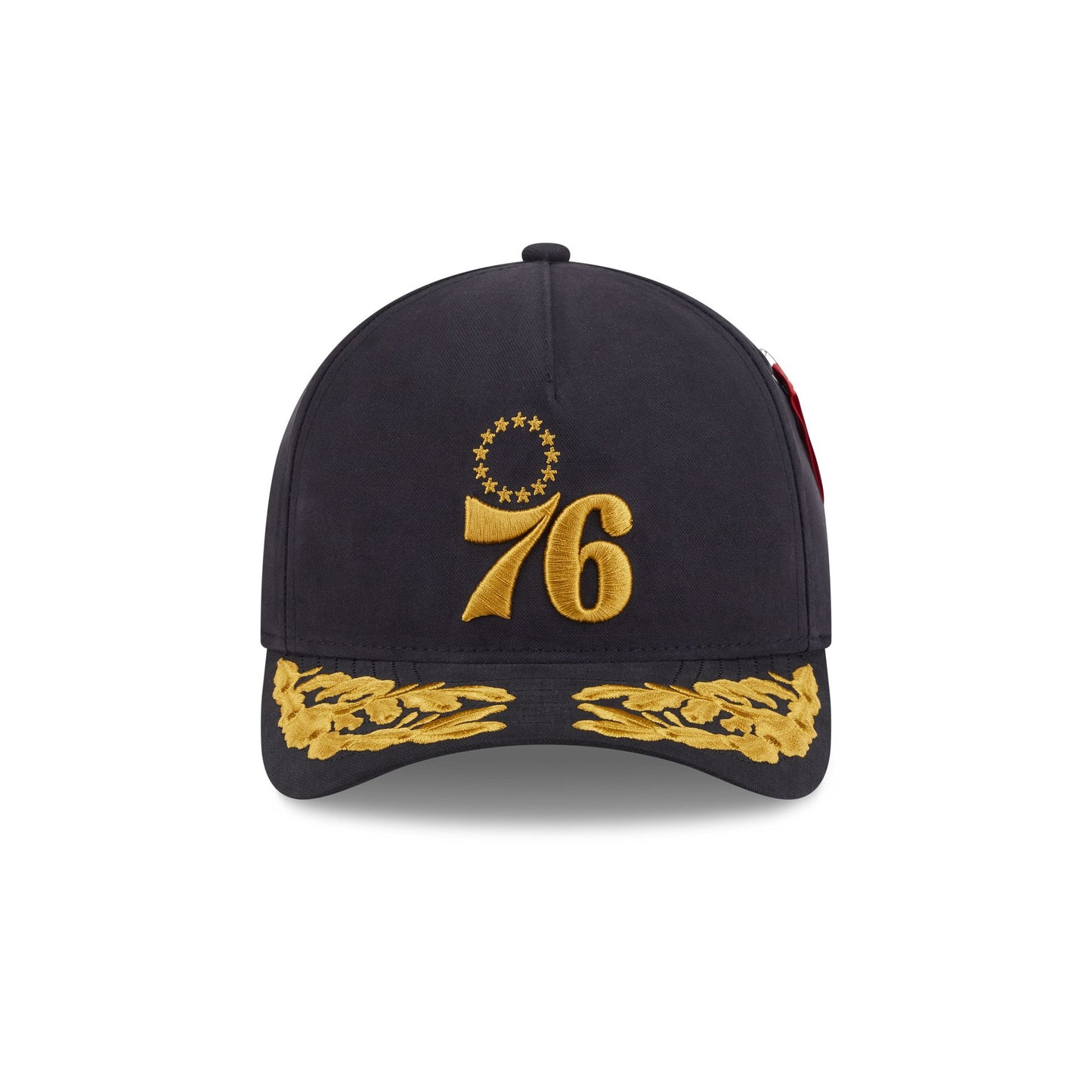 The Alpha Industries x Philadelphia 76ers Black 9FORTY M-Crown A-Frame Snapback features a gold embroidered 76ers logo at the front with a matching team wordmark above a snapback closure at the rear. Additional details include the signature Alpha Industries red ribbon at the left-wear side with embroidered gold leaf details at the visor and a black undervisor.