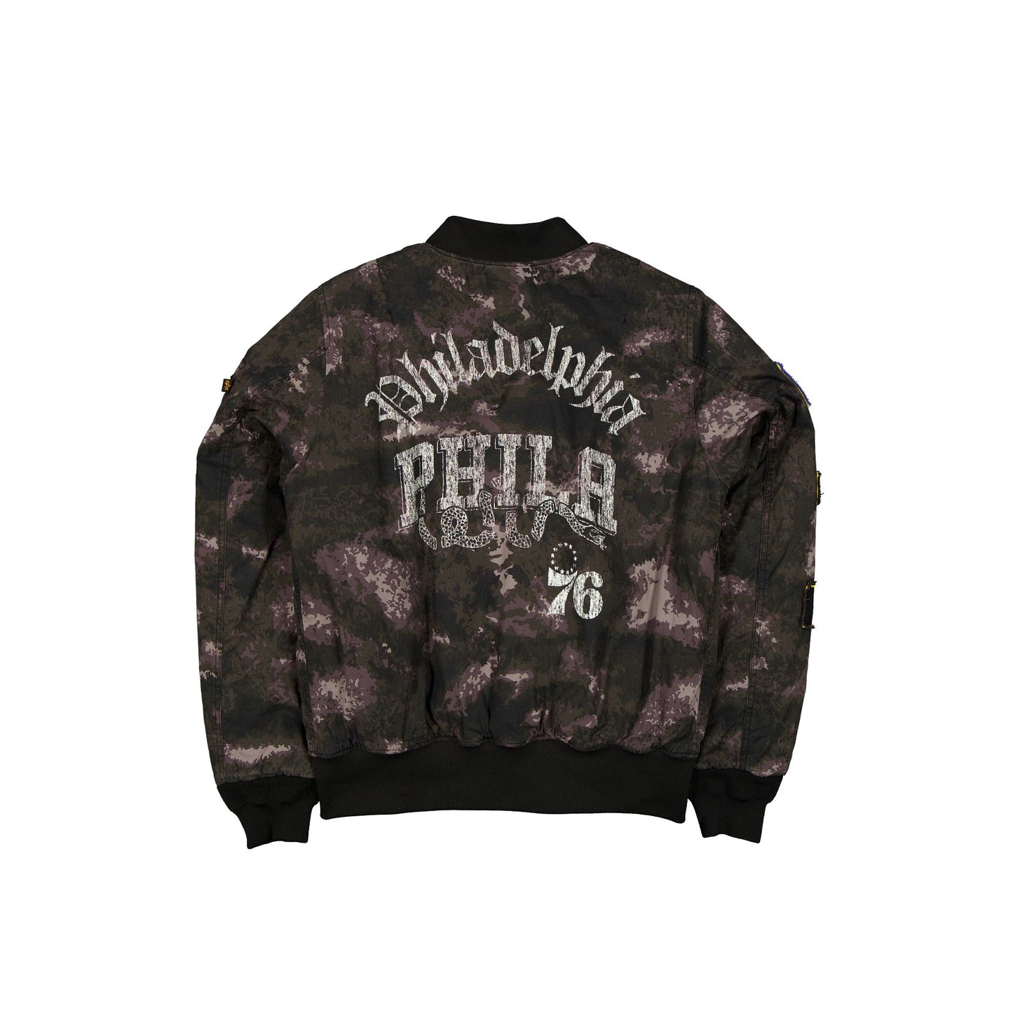 The Alpha Industries x Philadelphia 76ers Black Camo MA-1 Bomber Jacket features a screen-printed 76ers logo at the right chest with a matching team graphic at the rear, a full-zip closure at the front, and a woven New Era Cap x Alpha Industries tag at the hem. Additional details include frayed edge alternate team logos at the left chest with a Pennsylvania flag, New Era Cap patch, and Pennsylvania flower patch at the right sleeve. Further details include the Wells Fargo Center arena blueprint at the interior lining.