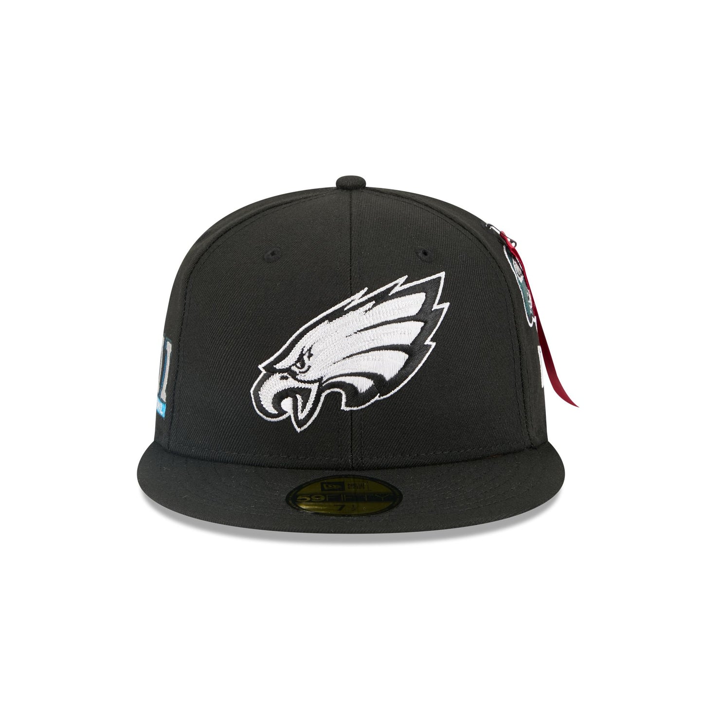 The Alpha Industries x Philadelphia Eagles Black 59FIFTY Fitted Cap features an embroidered black and white Eagles logo at the front panels with a signature Alpha Industries red ribbon and an alternate team logo at the left-wear side and a Super Bowl LII patch at the right-wear side. Additional details include a woven New Era Cap x Alpha Industries tag above a matching NFL Shield at the rear with an BLANK patch to the left and a team wordmark to the right.