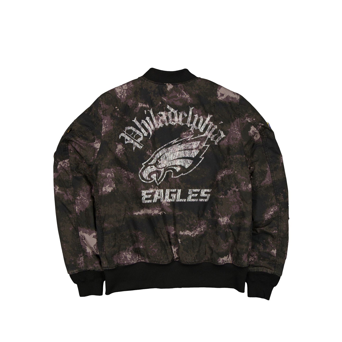 The Alpha Industries x Philadelphia Eagles Black Camo MA-1 Bomber Jacket features a screen-printed Eagles logo at the right chest with a matching team graphic at the rear, a full-zip closure at the front, and a woven New Era Cap x Alpha Industries tag at the hem. Additional details include a frayed edge alternate team logo at the left chest with a Pennsylvania state flag, New Era Cap patch, and Pennsylvania state flower patch at the right sleeve. Further details include the Lincoln Financial Field blueprint at the interior lining.
