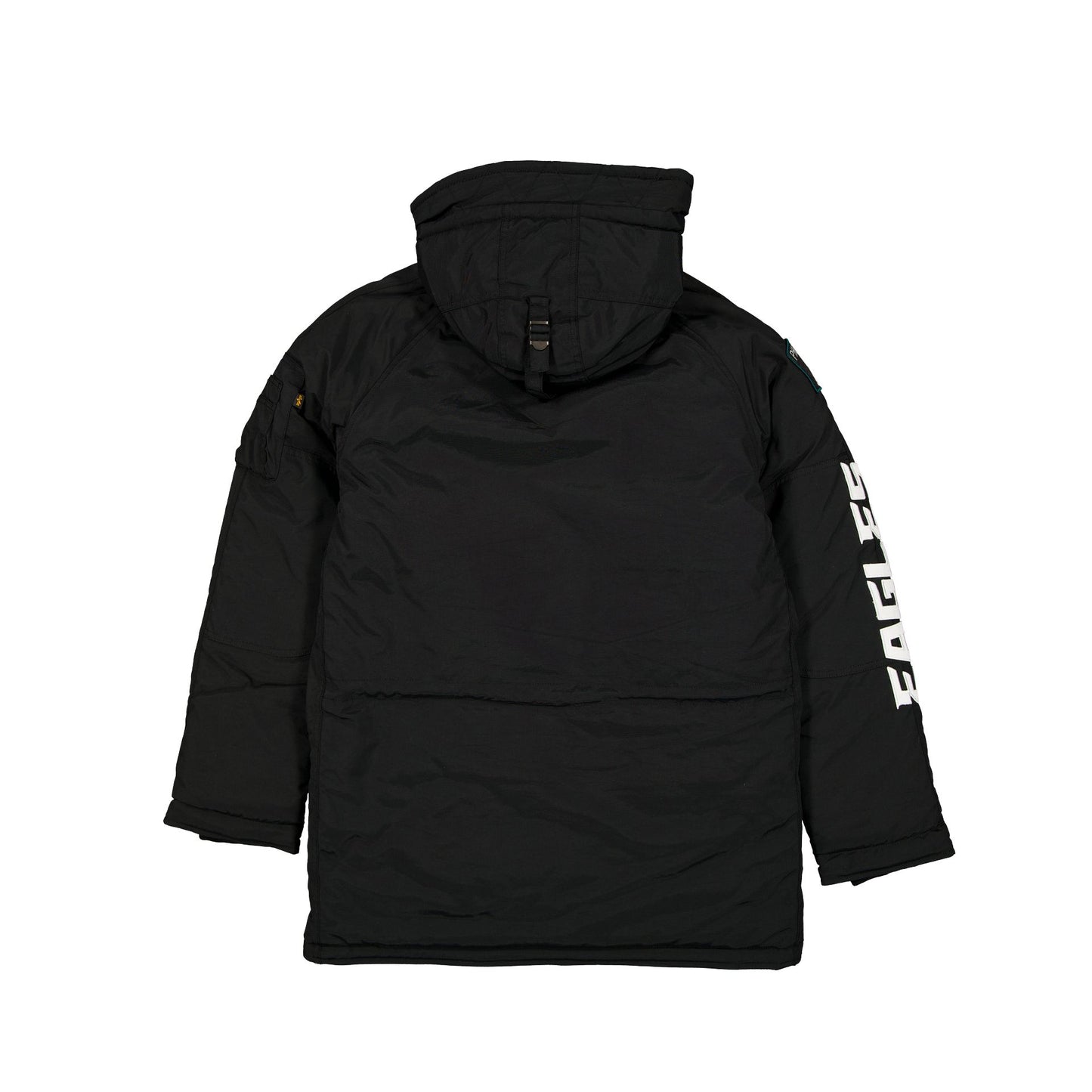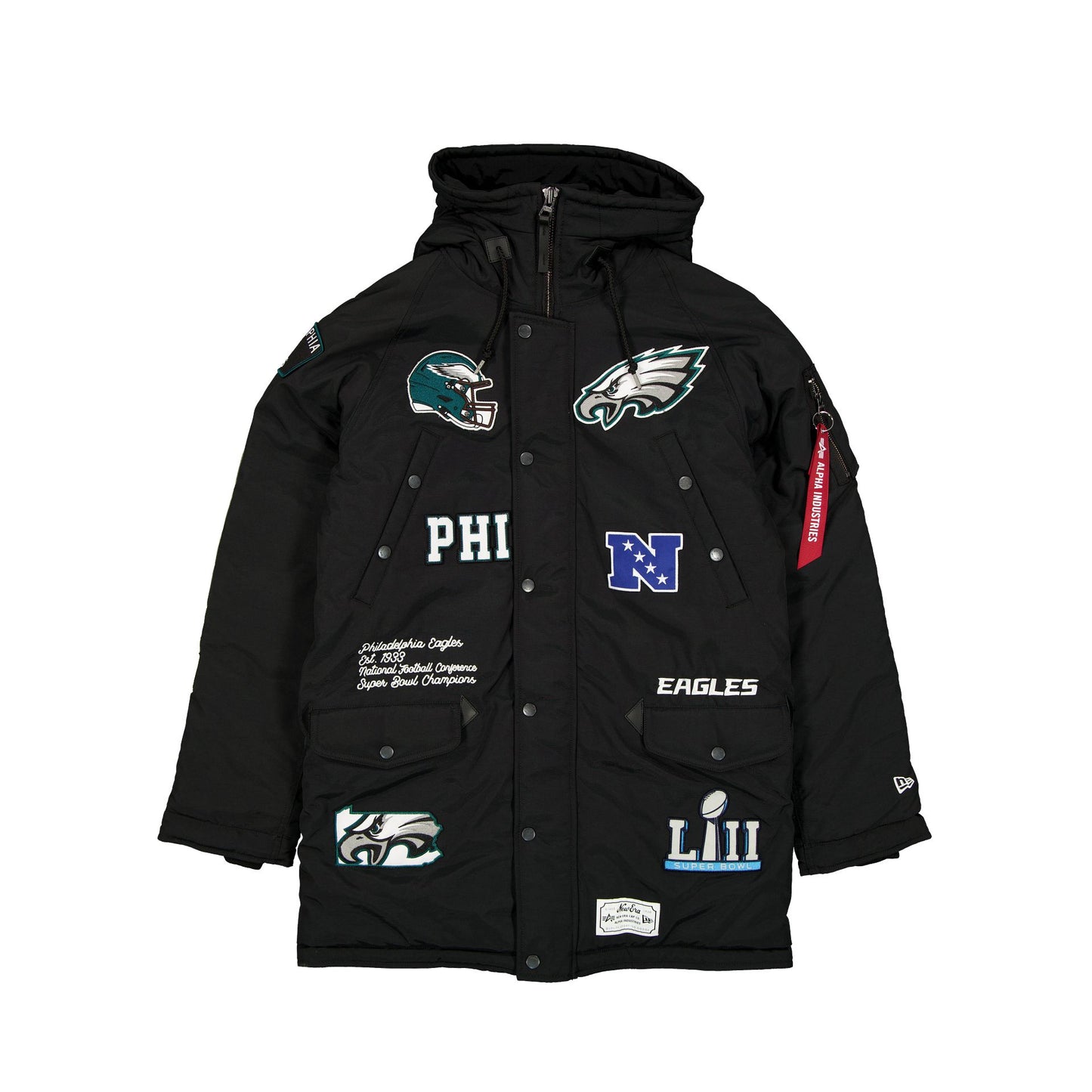 The Alpha Industries x Philadelphia Eagles Black N-3B Parka Jacket features an embroidered Eagles logo at the left chest with alternate team logos, an NFC logo, and a Super Bowl LVII patch at the front. Additional details include a Philadelphia Eagles Est. 1933, National Football Conference Super Bowl Champions script above the snap button closure pocket with a utility pocket with the signature Alpha Industries red ribbon at the left sleeve, a team wordmark and logo at the right sleeve. Further details include a full-zip, snap button closure at the front with a woven New Era Cap x Alpha Industries tag at the hem and New Era shoulder straps at the interior.