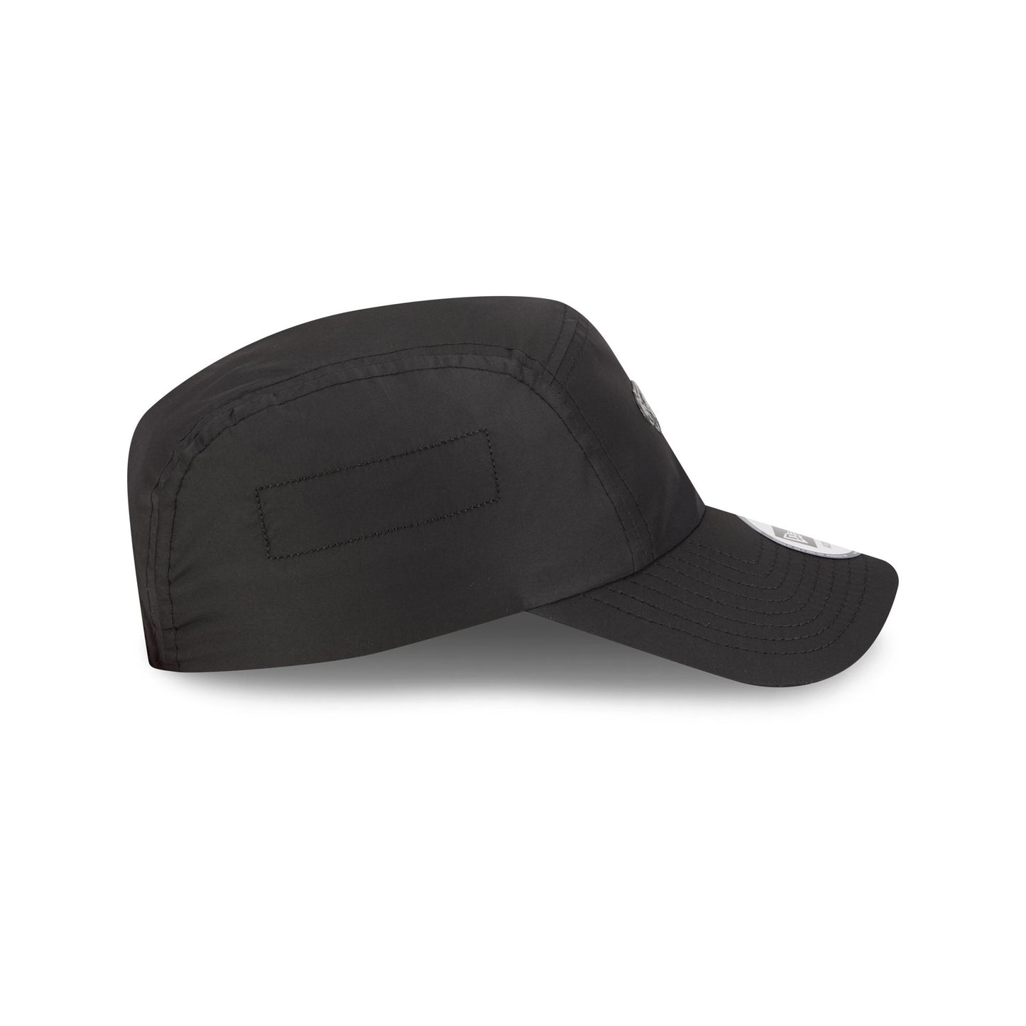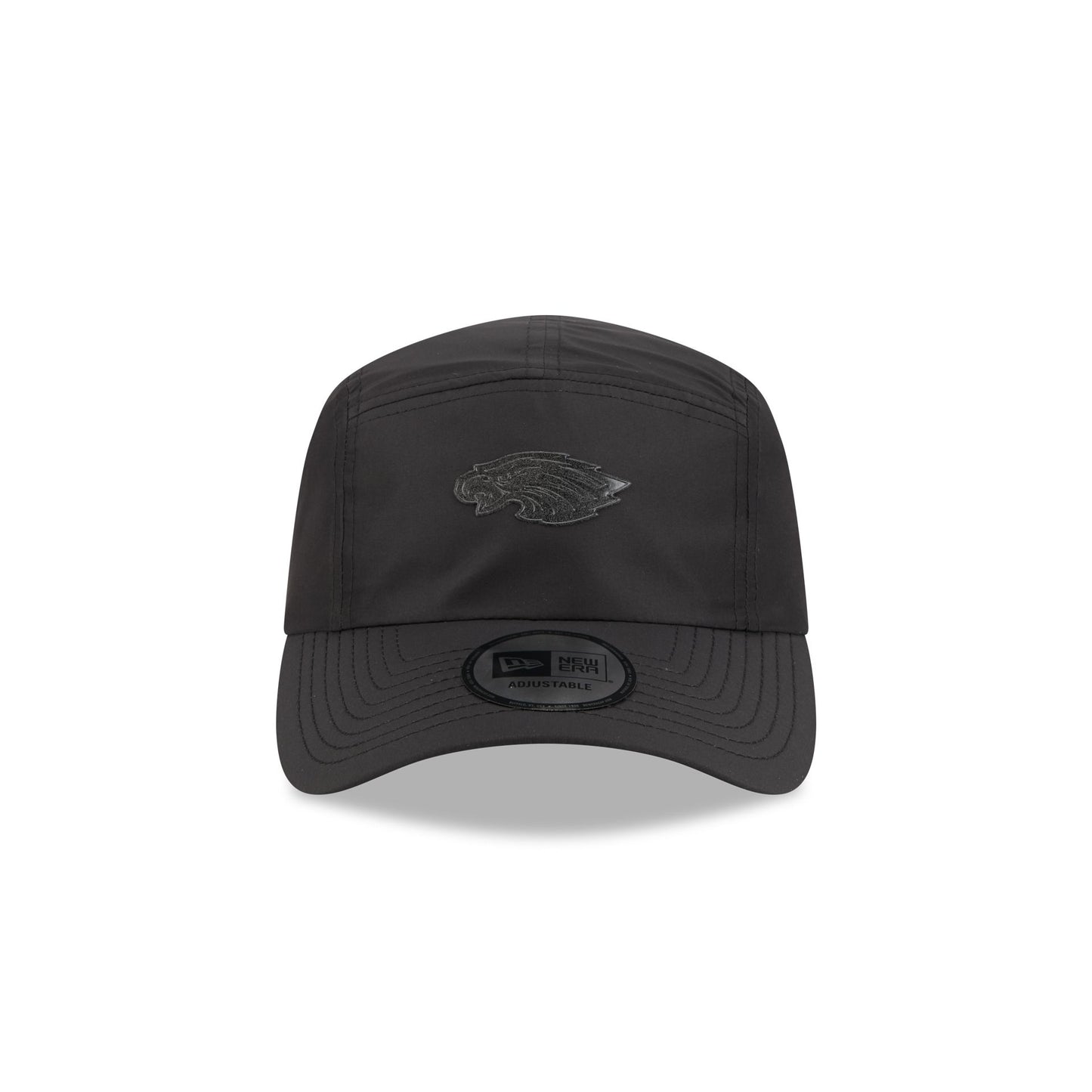 The Alpha Industries x Philadelphia Eagles Black Runner Adjustable Cap features a silicone Eagles logo at the front with a woven New Era Cap x Alpha Industries tag above an adjustable Alpha Industries red ribbon strapback closure at the rear.