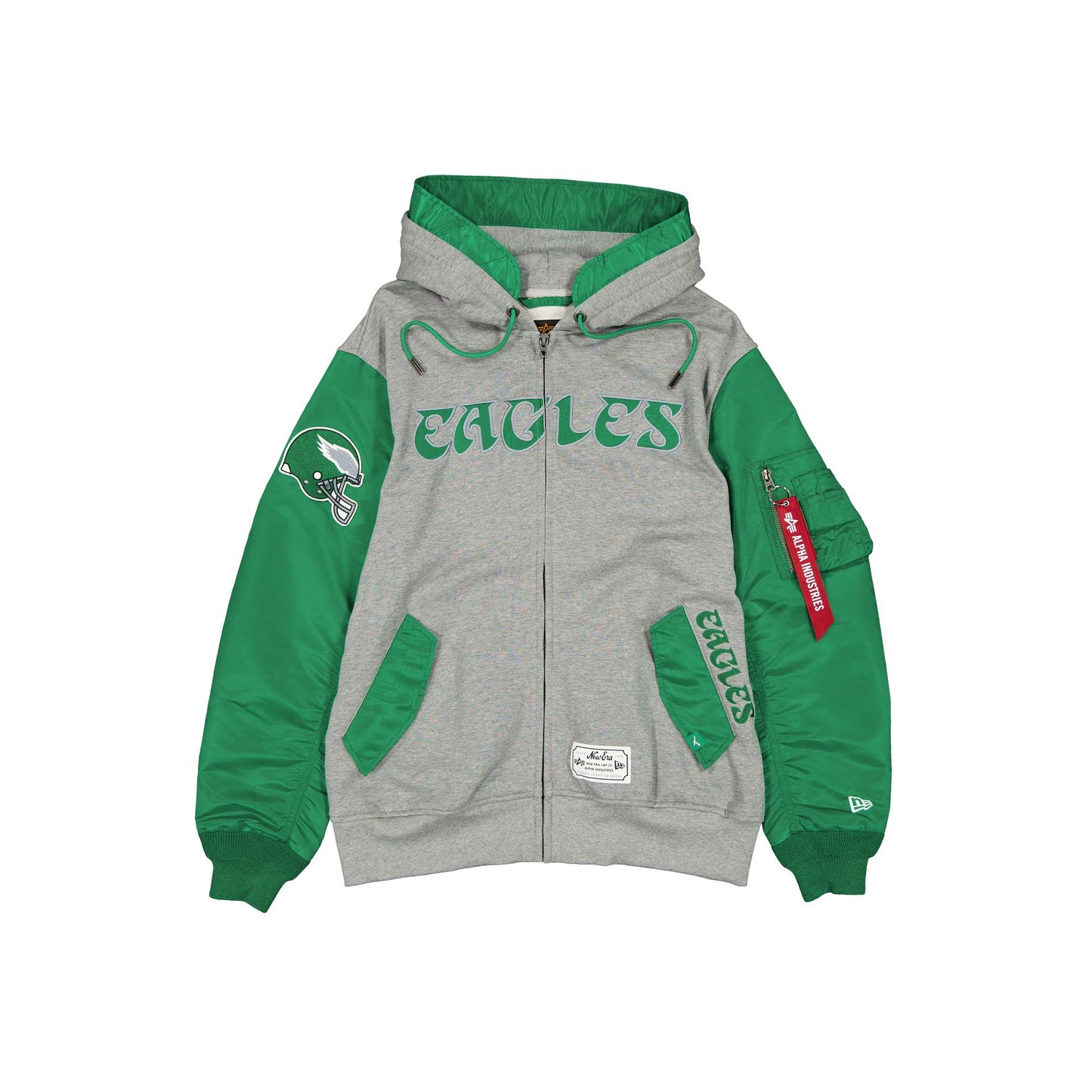 The Alpha Industries x Philadelphia Eagles Historic Gray MA-1 Full Zip Fleece Jacket features a nylon applique Eagles wordmark at the chest with an embroidered team wordmark and woven team logo tag at the snap button pocket. Additional details include a full-zip closure at the front with a woven New Era Cap x Alpha Industries tag at the hem, a utility pocket with the signature Alpha Industries red ribbon at the left sleeve, and an alternate team logo patch embroidered at the right sleeve.