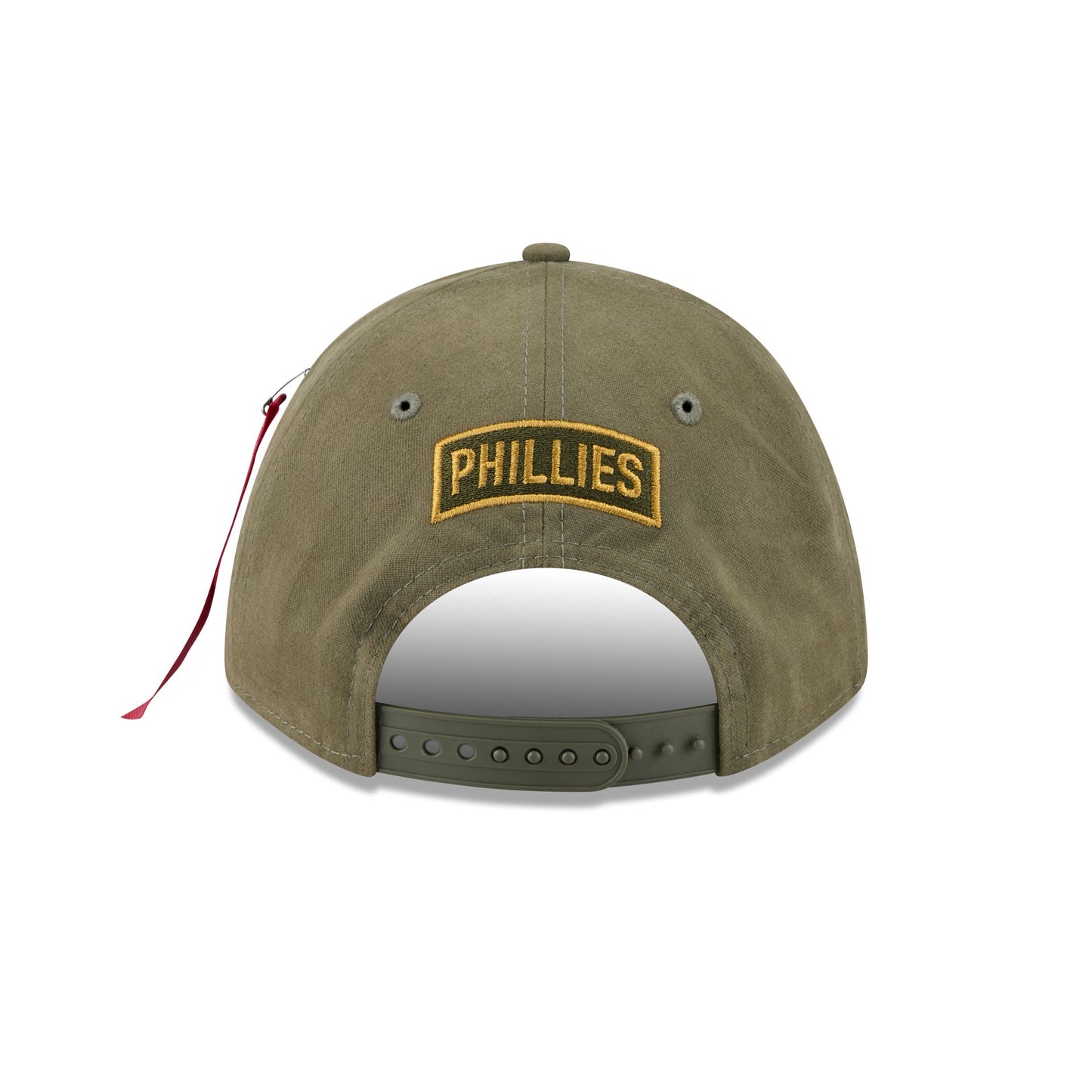 The Alpha Industries x Philadelphia Phillies Olive Green 9FORTY M-Crown A-Frame Snapback features a gold embroidered Phillies logo at the front with a matching team wordmark above a snapback closure at the rear. Additional details include the signature Alpha Industries red ribbon at the left-wear side with embroidered gold leaf details at the visor and a black undervisor.