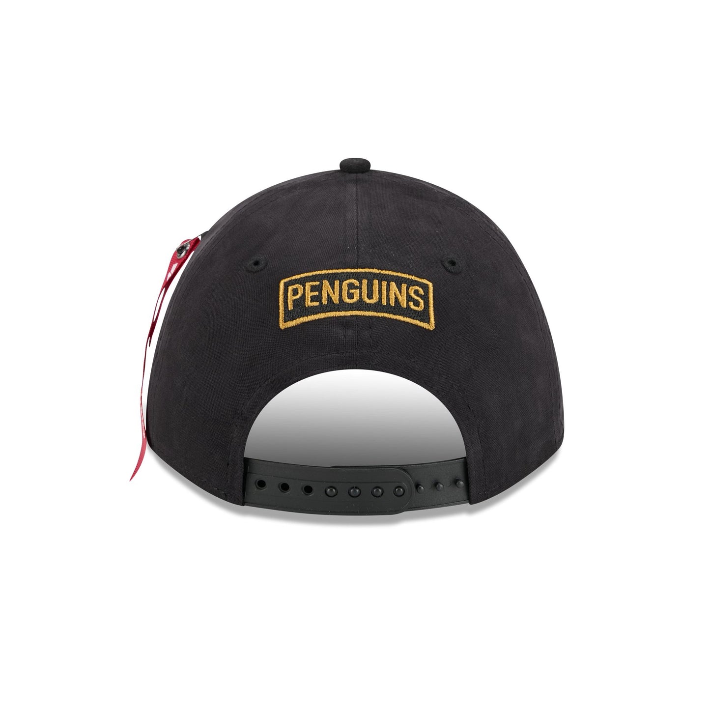 The Alpha Industries x Pittsburgh Penguins Black 9FORTY M-Crown A-Frame Snapback features a gold embroidered Penguins logo at the front with a matching team wordmark above a snapback closure at the rear. Additional details include the signature Alpha Industries red ribbon at the left-wear side with embroidered gold leaf details at the visor and a black undervisor.