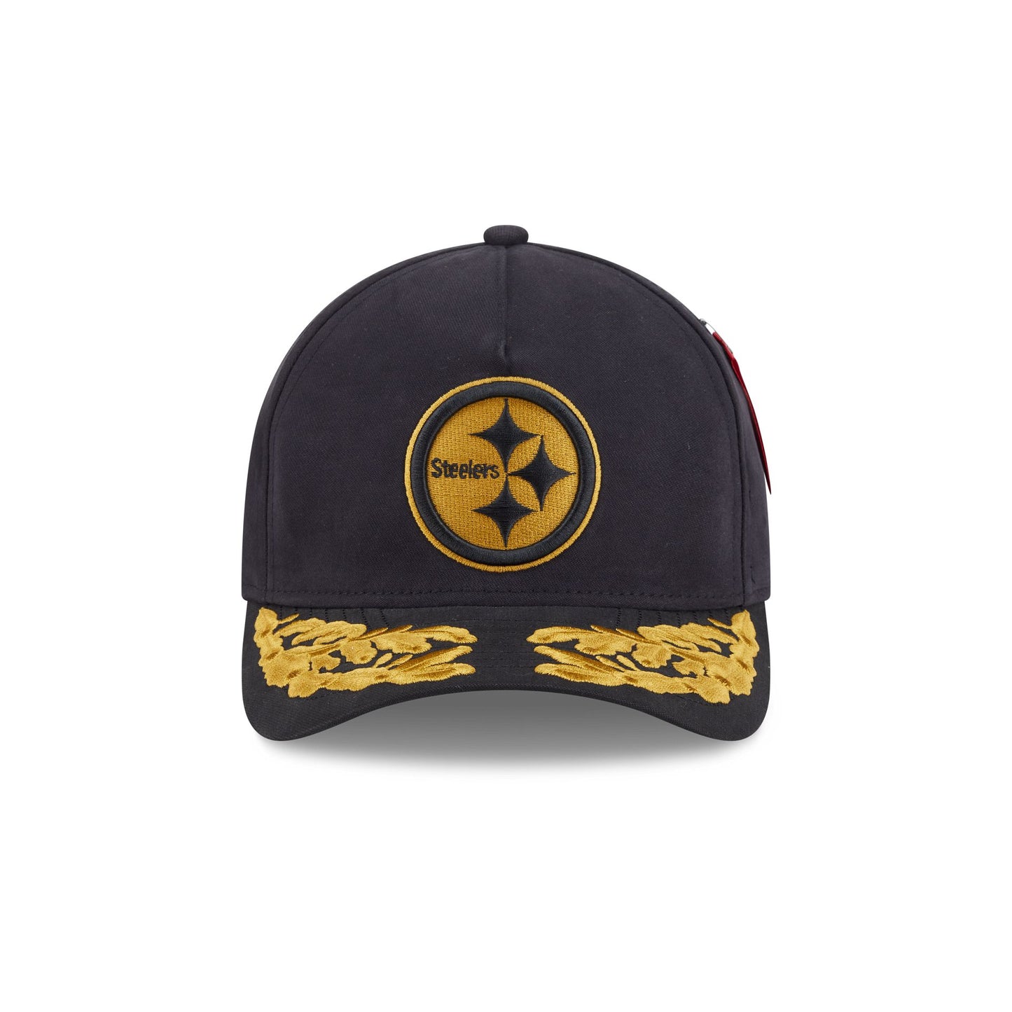The Alpha Industries x Pittsburgh Steelers Black 9FORTY M-Crown A-Frame Snapback features a gold embroidered Steelers logo at the front with a matching team wordmark above a snapback closure at the rear. Additional details include the signature Alpha Industries red ribbon at the left-wear side with embroidered gold leaf details at the visor and a black undervisor.