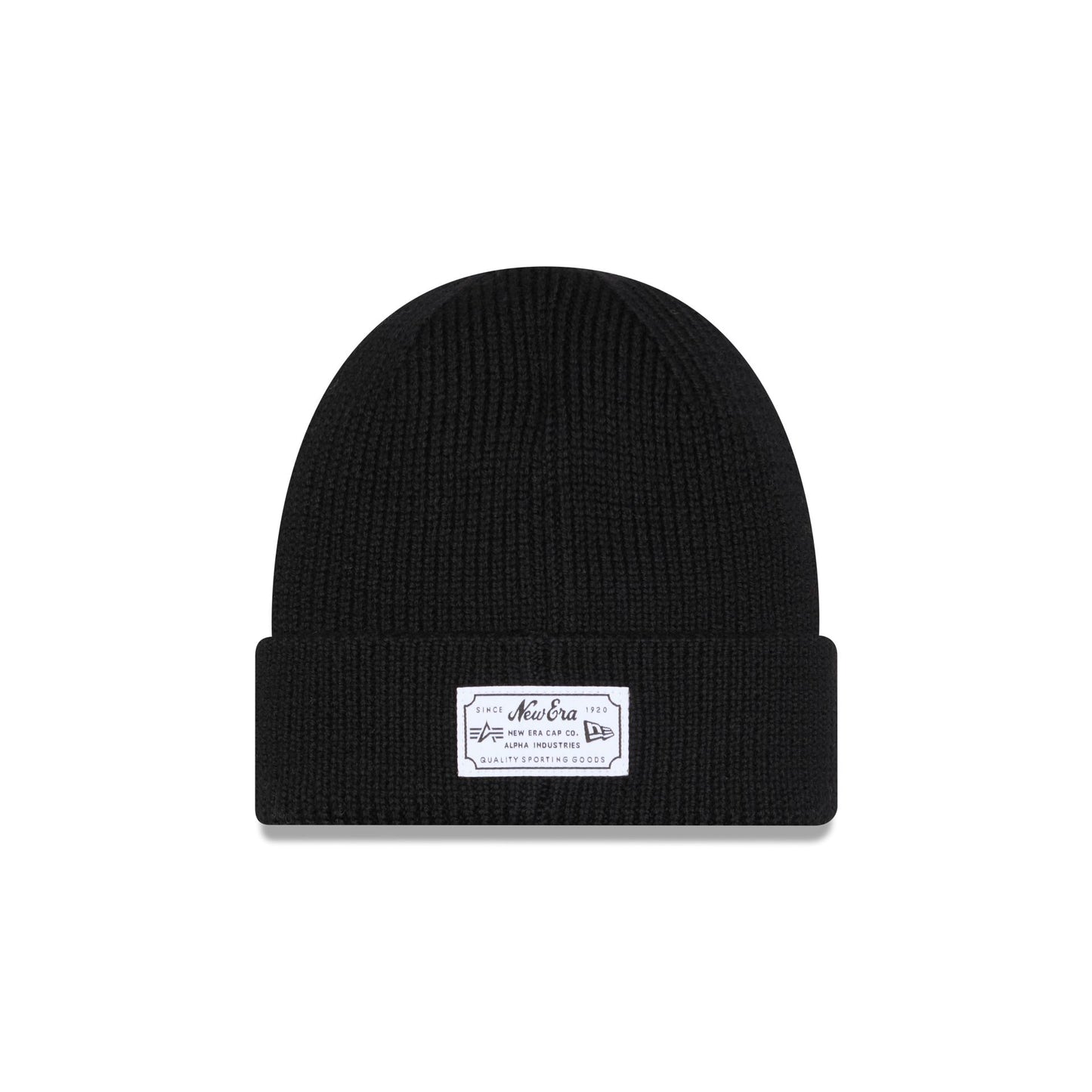The Alpha Industries x San Diego Padres Black Cuff Knit features an embroidered black and white Padres logo at the front with the signature Alpha Industries red ribbon at the crown and a woven New Era Cap x Alpha Industries tag at the rear.
