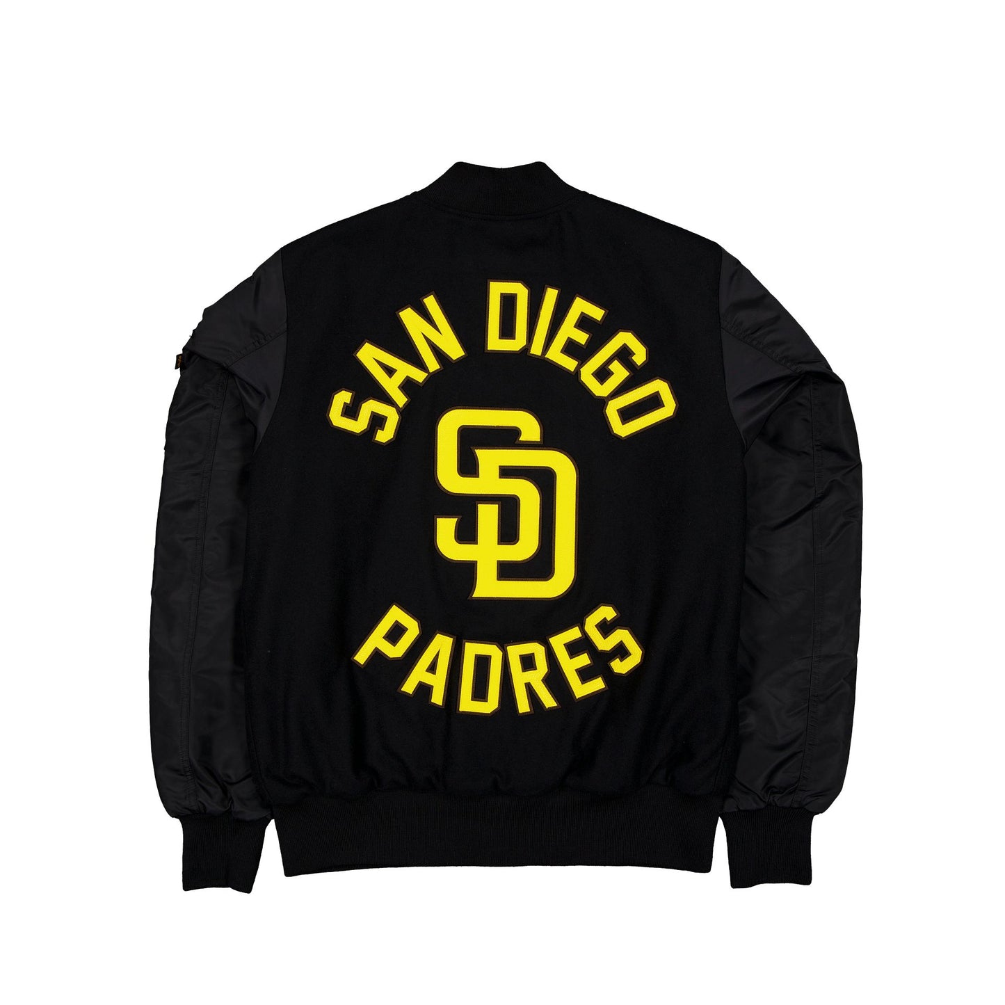 The Alpha Industries x San Diego Padres MA-1 Wool Varsity Jacket features a faux leather applique Padres logo at the left chest with a matching team logo and wordmark at the rear. Additional details include a utility pocket with the Alpha Industries ribbon at the left sleeve and an embroidered Padres patch at the right sleeve.
