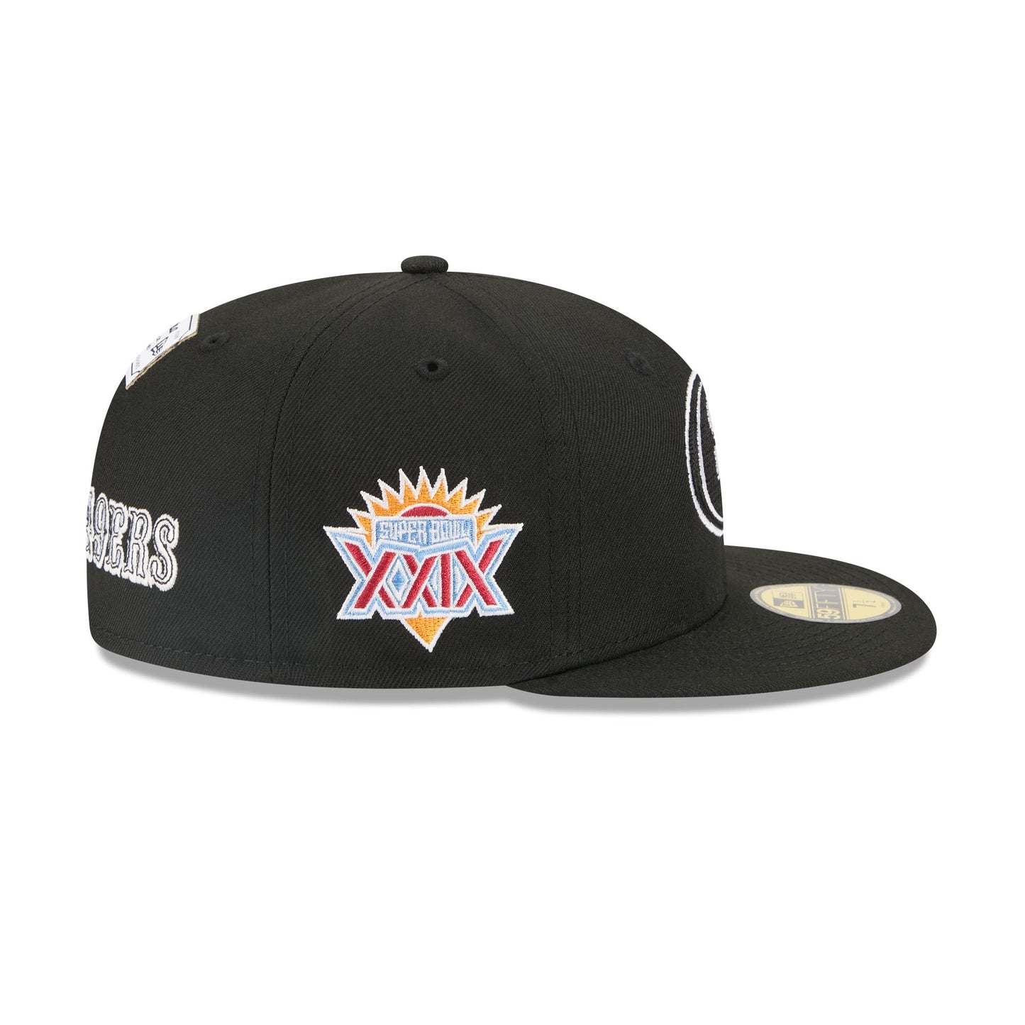 The Alpha Industries x San Francisco 49ers Black 59FIFTY Fitted Cap features an embroidered black and white 49ers logo at the front panels with a signature Alpha Industries red ribbon and an alternate team logo at the left-wear side and a Super Bowl XXIX patch at the right-wear side. Additional details include a woven New Era Cap x Alpha Industries tag above a matching NFL Shield at the rear with an BLANK patch to the left and a team wordmark to the right.