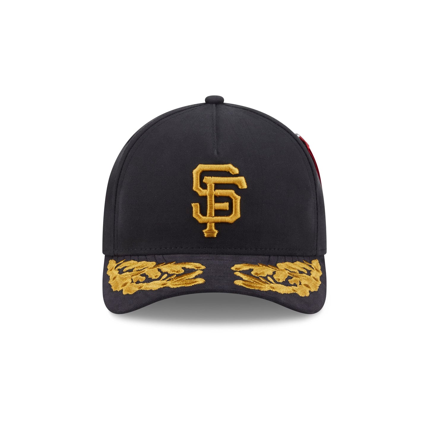 The Alpha Industries x San Francisco Giants Black 9FORTY M-Crown A-Frame Snapback features a gold embroidered Giants logo at the front with a matching team wordmark above a snapback closure at the rear. Additional details include the signature Alpha Industries red ribbon at the left-wear side with embroidered gold leaf details at the visor and a black undervisor.