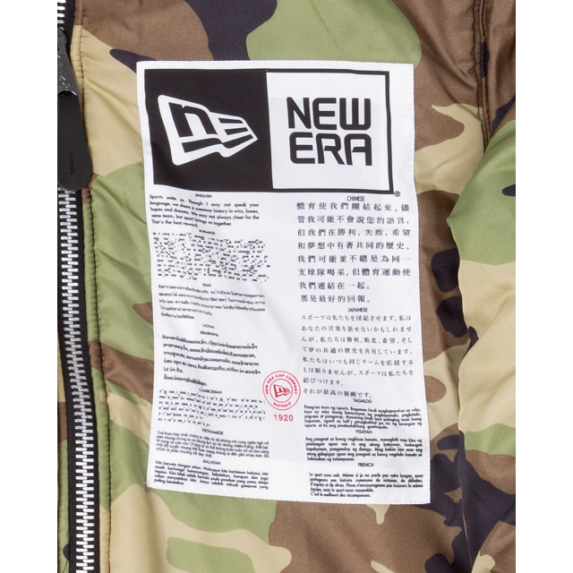 The Alpha Industries x San Francisco Giants MA-1 Bomber Jacket features embroidered Giants patches throughout the chest and sleeves with an embroidered applique team wordmark at the rear. Additional details include a utility pocket with the Alpha Industries ribbon at the left sleeve. The reversible jacket features a camo fabrication at the interior with a multi-lingual message at the left chest and a screen-printed team logo at the rear.