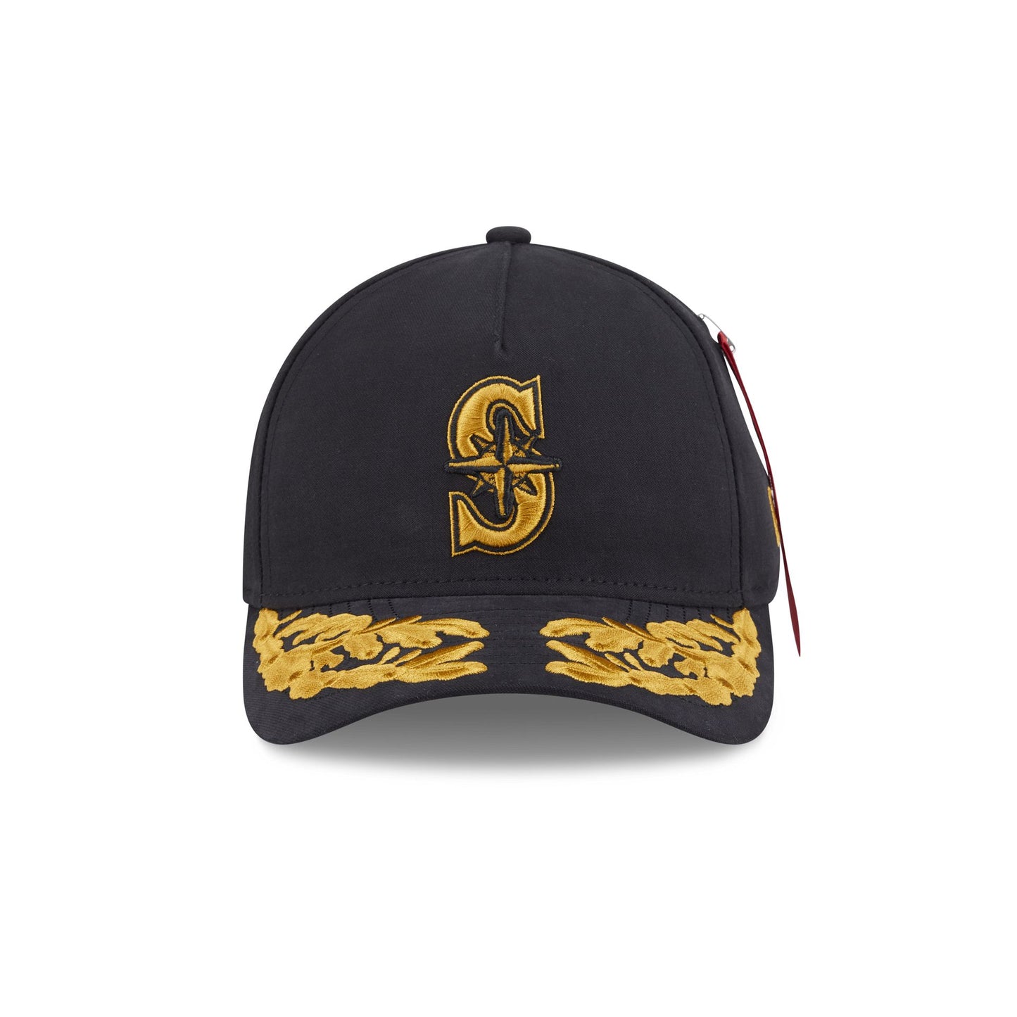 The Alpha Industries x Seattle Mariners Black 9FORTY M-Crown A-Frame Snapback features a gold embroidered Mariners logo at the front with a matching team wordmark above a snapback closure at the rear. Additional details include the signature Alpha Industries red ribbon at the left-wear side with embroidered gold leaf details at the visor and a black undervisor.