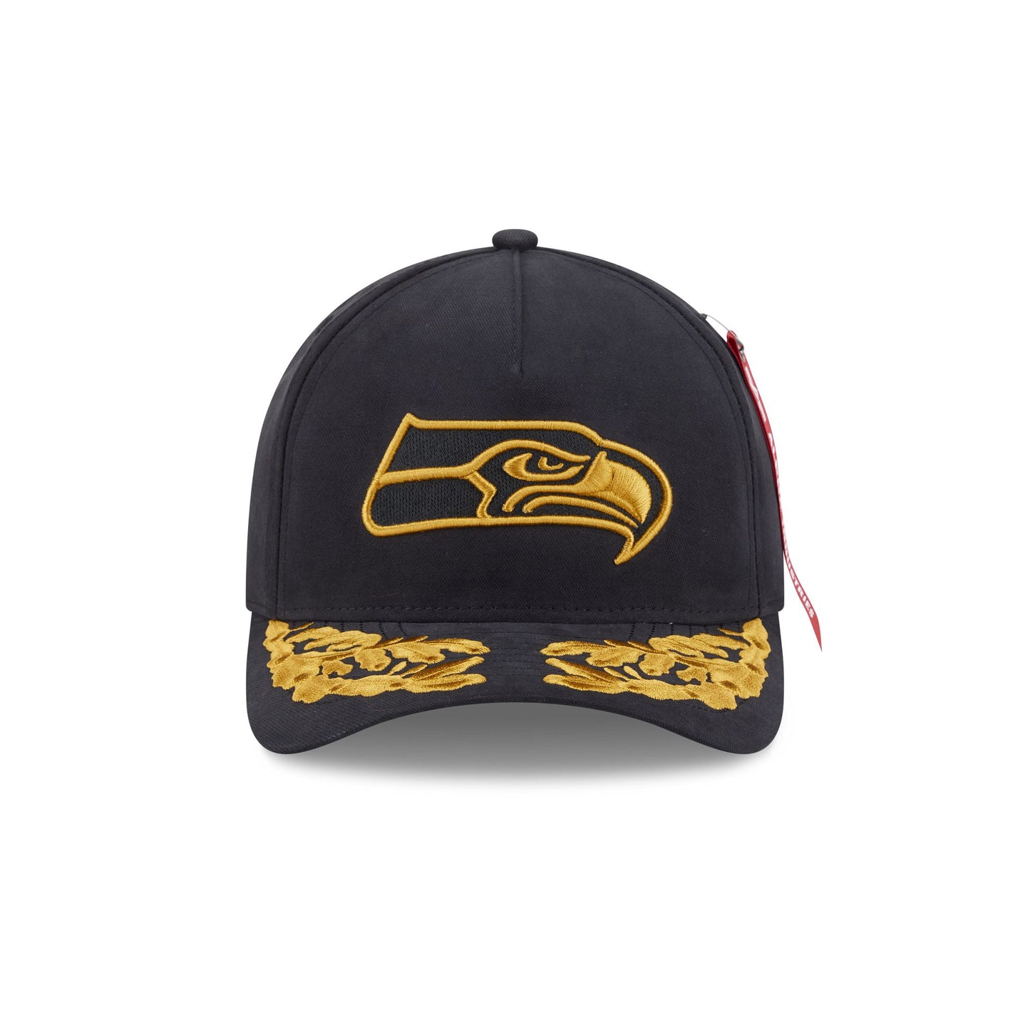The Alpha Industries x Seattle Seahawks Black 9FORTY M-Crown A-Frame Snapback features a gold embroidered Seahawks logo at the front with a matching team wordmark above a snapback closure at the rear. Additional details include the signature Alpha Industries red ribbon at the left-wear side with embroidered gold leaf details at the visor and a black undervisor.