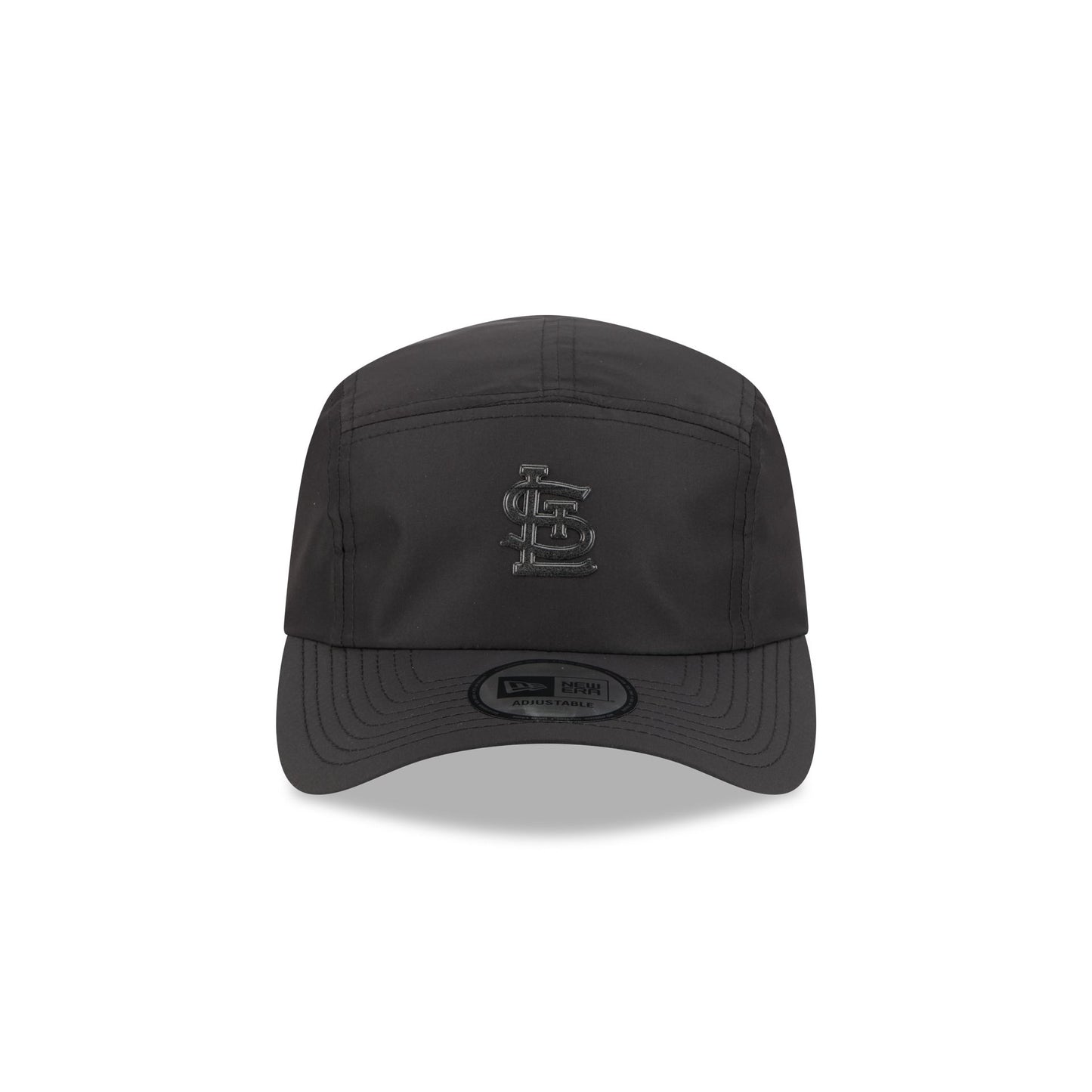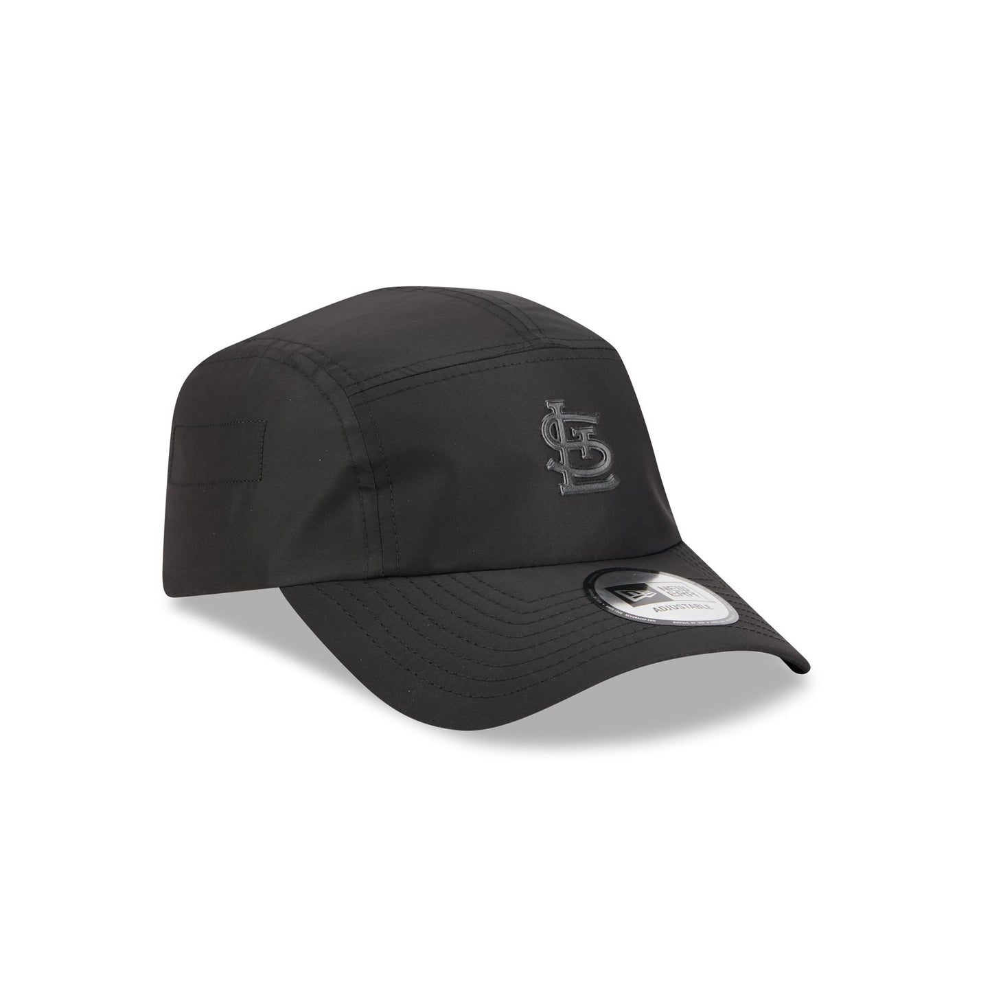 The Alpha Industries x St. Louis Cardinals Black Runner Adjustable Cap features a silicone Cardinals logo at the front with a woven New Era Cap x Alpha Industries tag above an adjustable Alpha Industries red ribbon strapback closure at the rear.