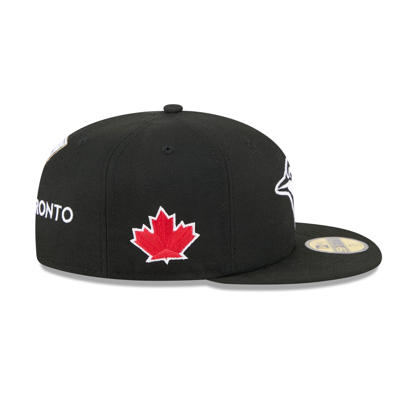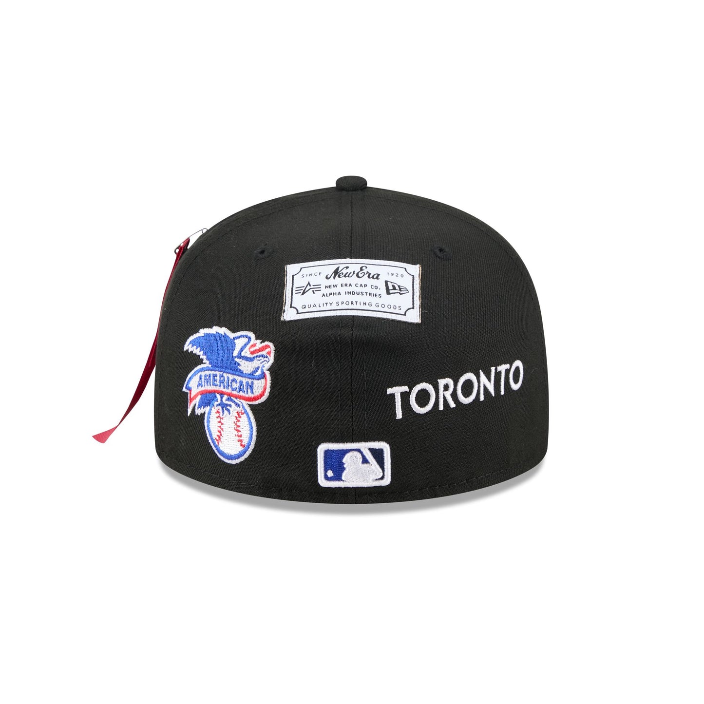 The Alpha Industries x Toronto Blue Jays Black 59FIFTY Fitted Cap features an embroidered black and white Blue Jays logo at the front panels with a signature Alpha Industries red ribbon at the left-wear side and an alternate team logo at the right-wear side. Additional details include a woven New Era Cap x Alpha Industries tag above a team color MLB Batterman logo at the rear with an American League patch to the left and a team wordmark to the right.