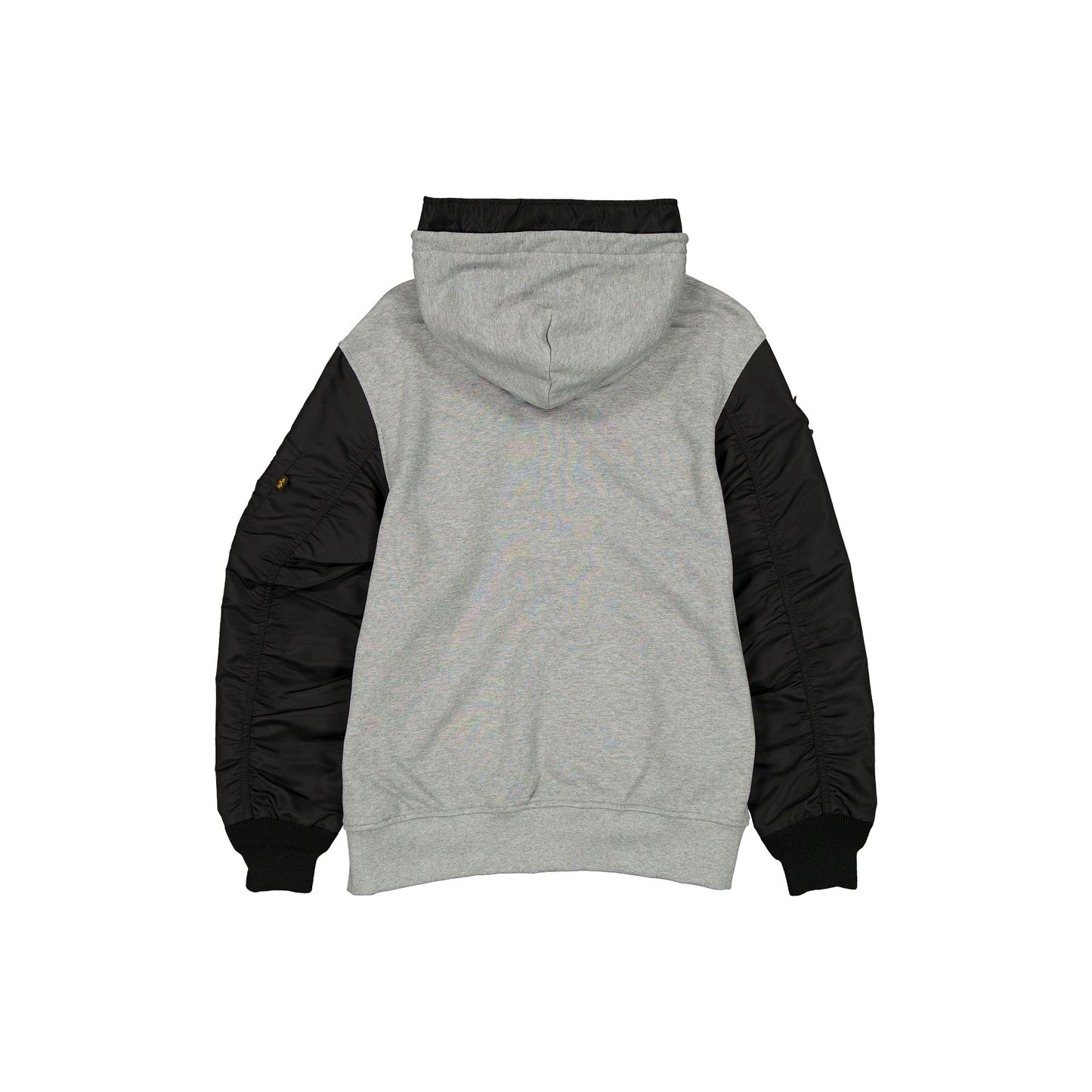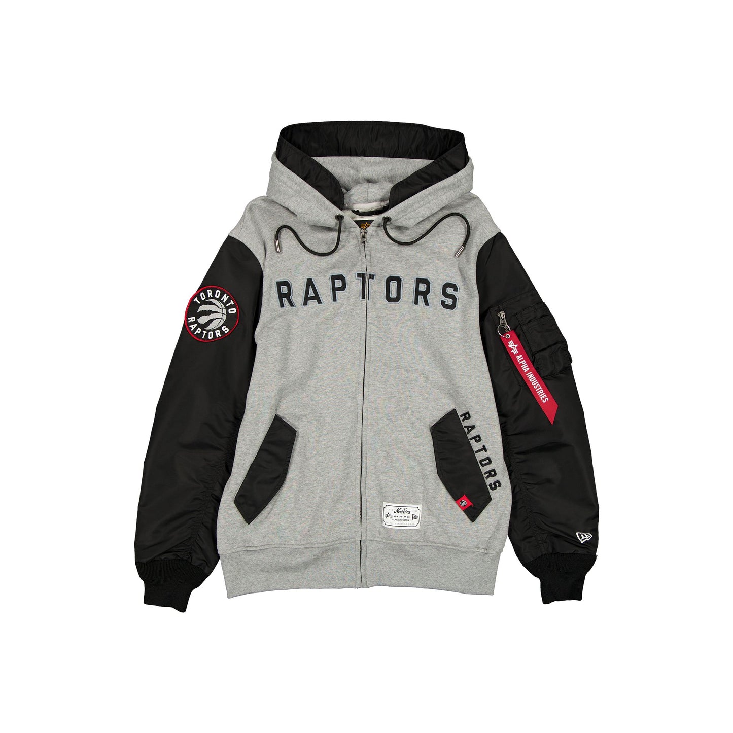 The Alpha Industries x Toronto Raptors Gray MA-1 Full Zip Fleece Jacket features a nylon applique Raptors wordmark at the chest with an embroidered team wordmark and woven team logo tag at the snap button pocket. Additional details include a full-zip closure at the front with a woven New Era Cap x Alpha Industries tag at the hem, a utility pocket with the signature Alpha Industries red ribbon at the left sleeve, and an alternate team logo patch embroidered at the right sleeve.