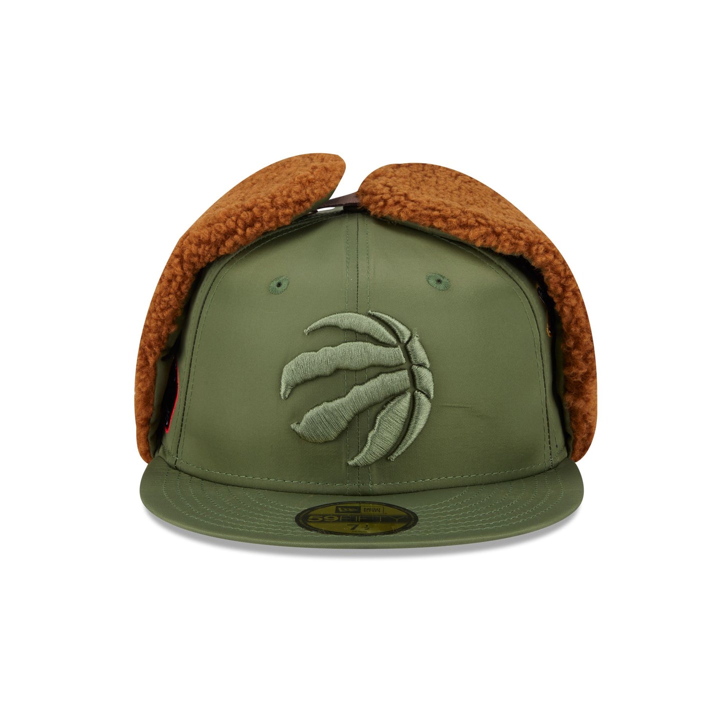 The Alpha Industries x Toronto Raptors Olive Green Dog Ear 59FIFTY Fitted Cap features a monochromatic embroidered Raptors logo at the front panels with a team state patch and an Eastern Conference logo at the left and right side of an NBA Logoman at the rear. Additional details include a signature Alpha Industries red ribbon and airplane patch at the left-wear side with a team patch at the right-wear side. The exterior ear cover details include a 1x NBA Champions patch with alternate team logos and a woven New Era Cap x Alpha Industries tag at the interior fleece lining with a snap button closure.