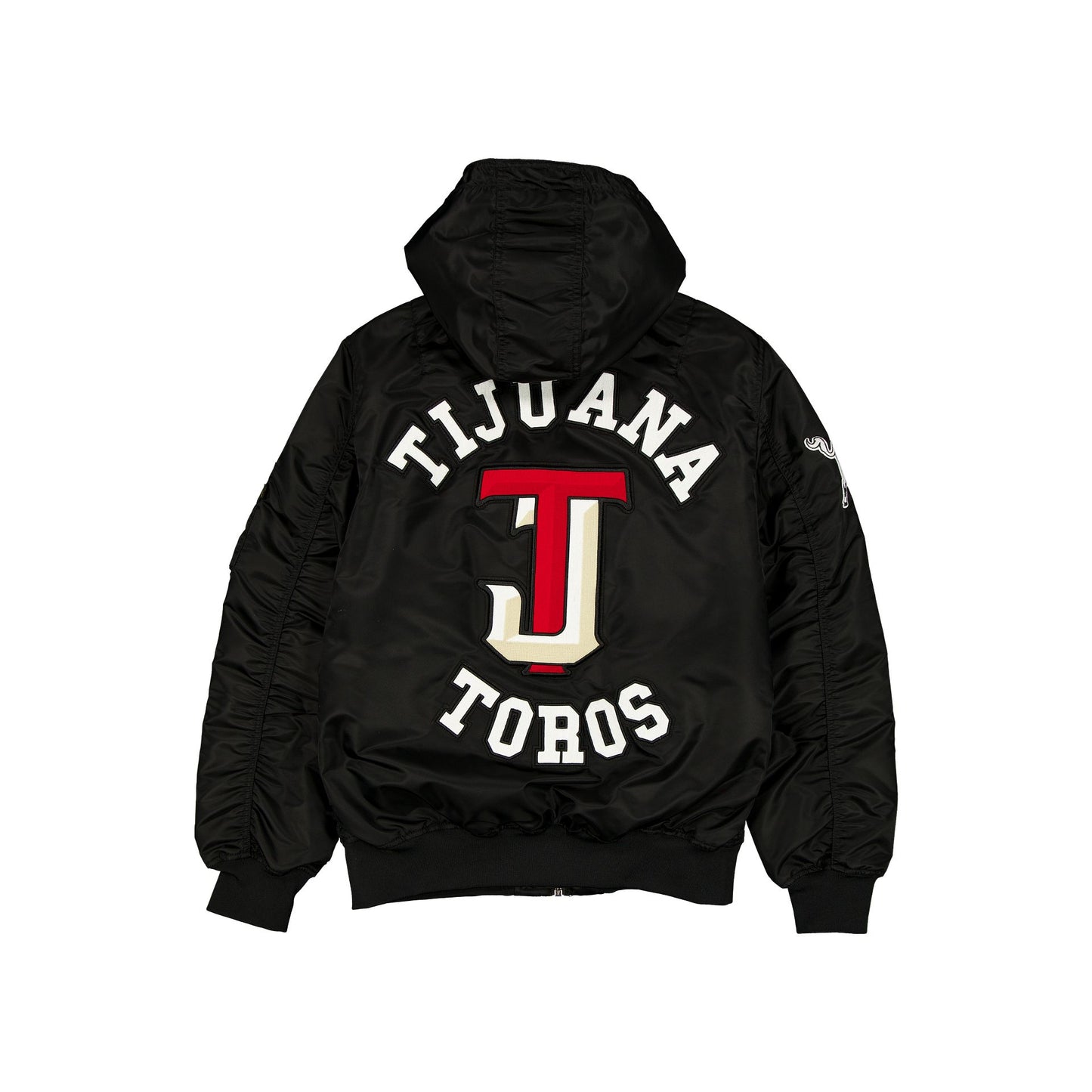 The Alpha Industries x Toros de Tijuana L-2B Bomber Jacket features an embroidered chain stitched applique Toros logo at the left chest with a utility pocket with the signature Alpha Industries red ribbon at the left sleeve and a matching team patches at the rear. Additional details include a team wordmark at right chest with an alternate team logo at the right sleeve and a woven New Era Cap jock tag and Alpha Industries tag at the hem.