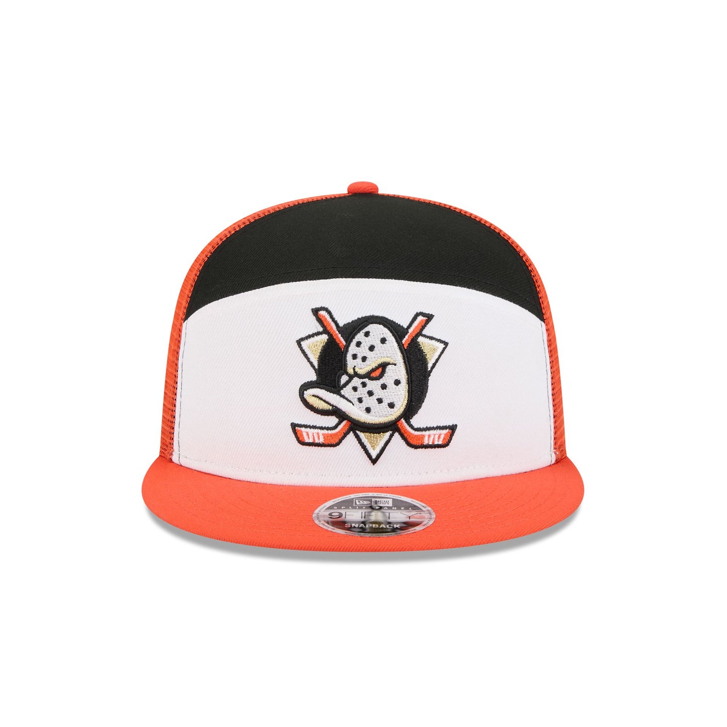 The Anaheim Ducks Block Split Panel 9FIFTY Trucker features an embroidered Ducks logo at the front panels with a split crown construction. Additional details include an adjustable snapback closure at a mesh rear and a gray undervisor.