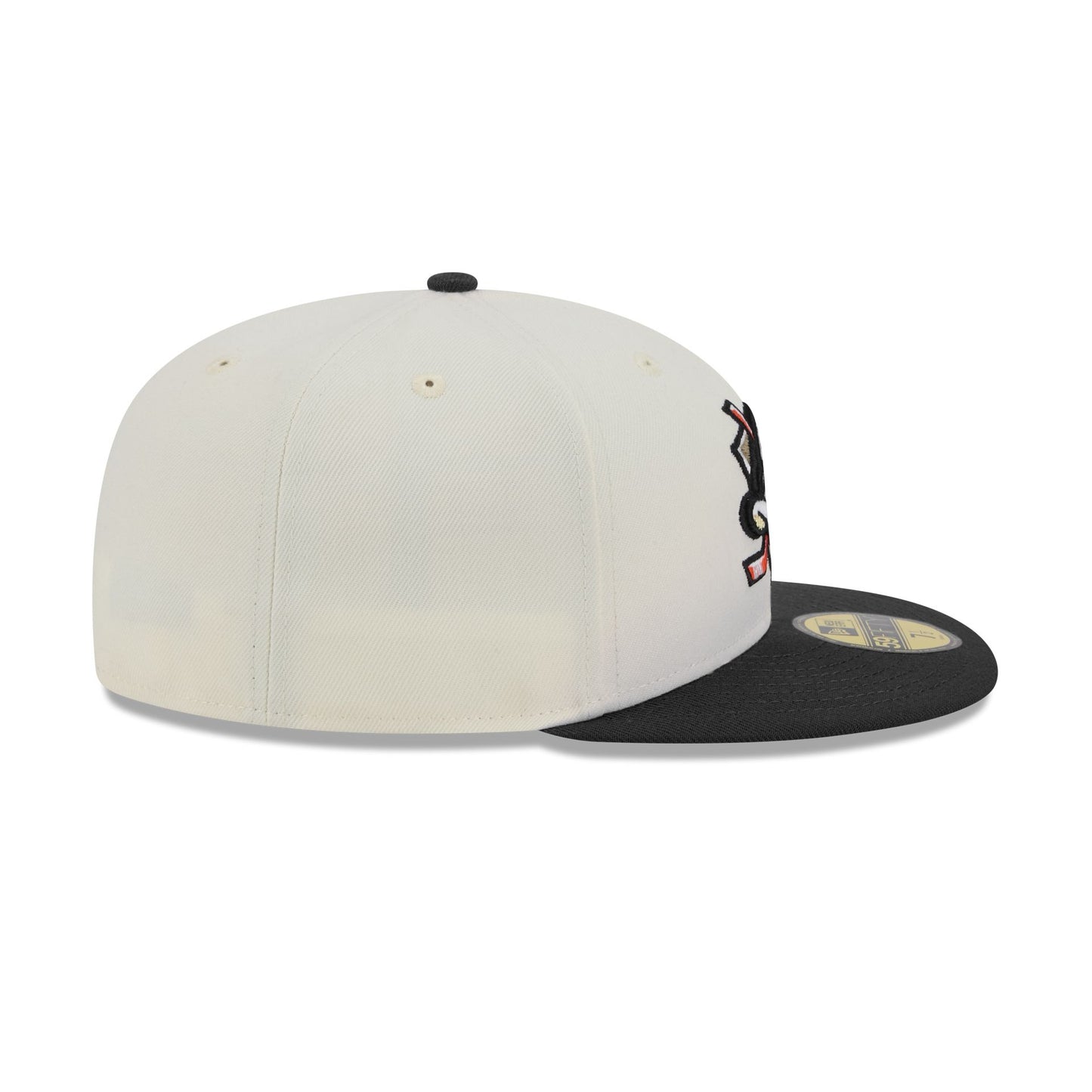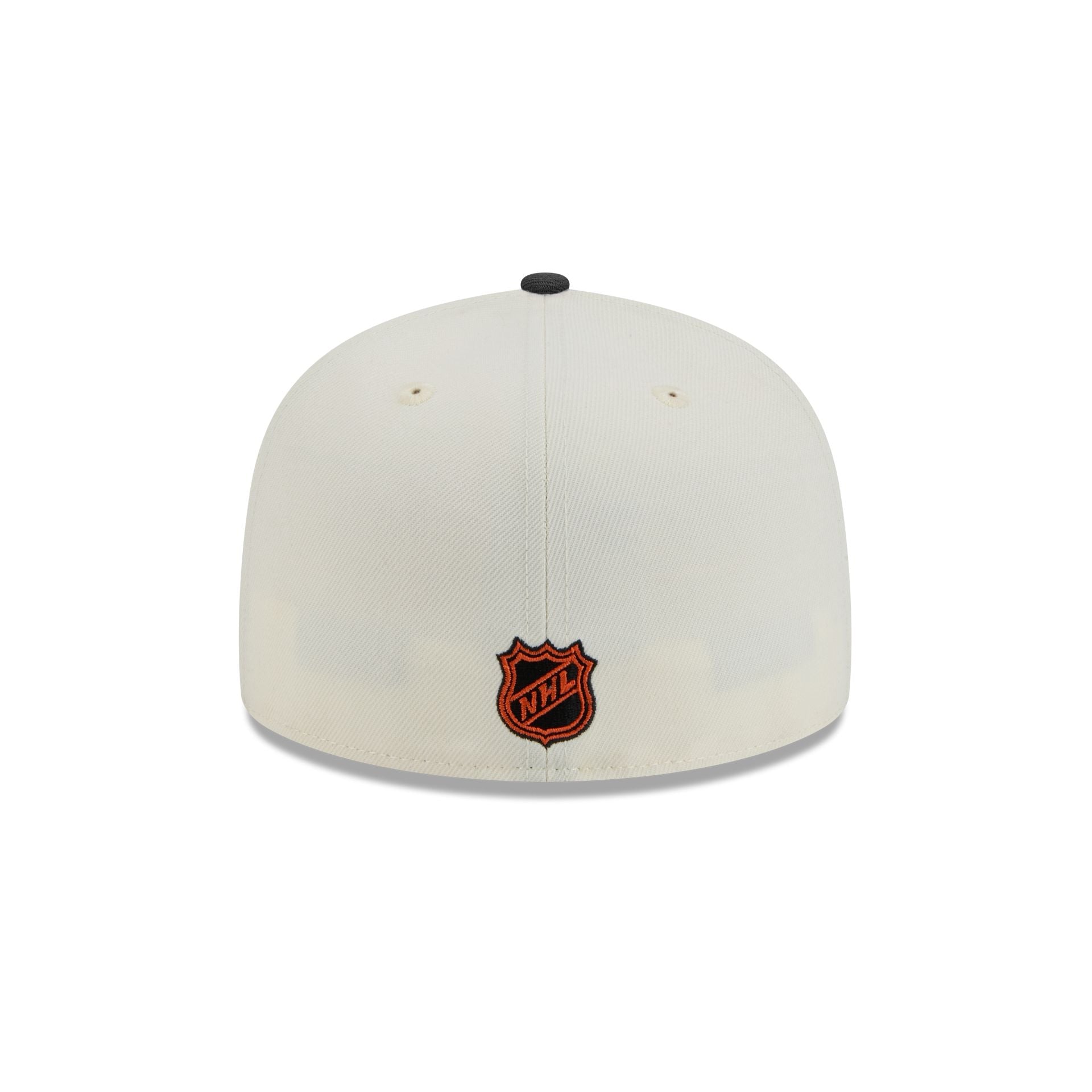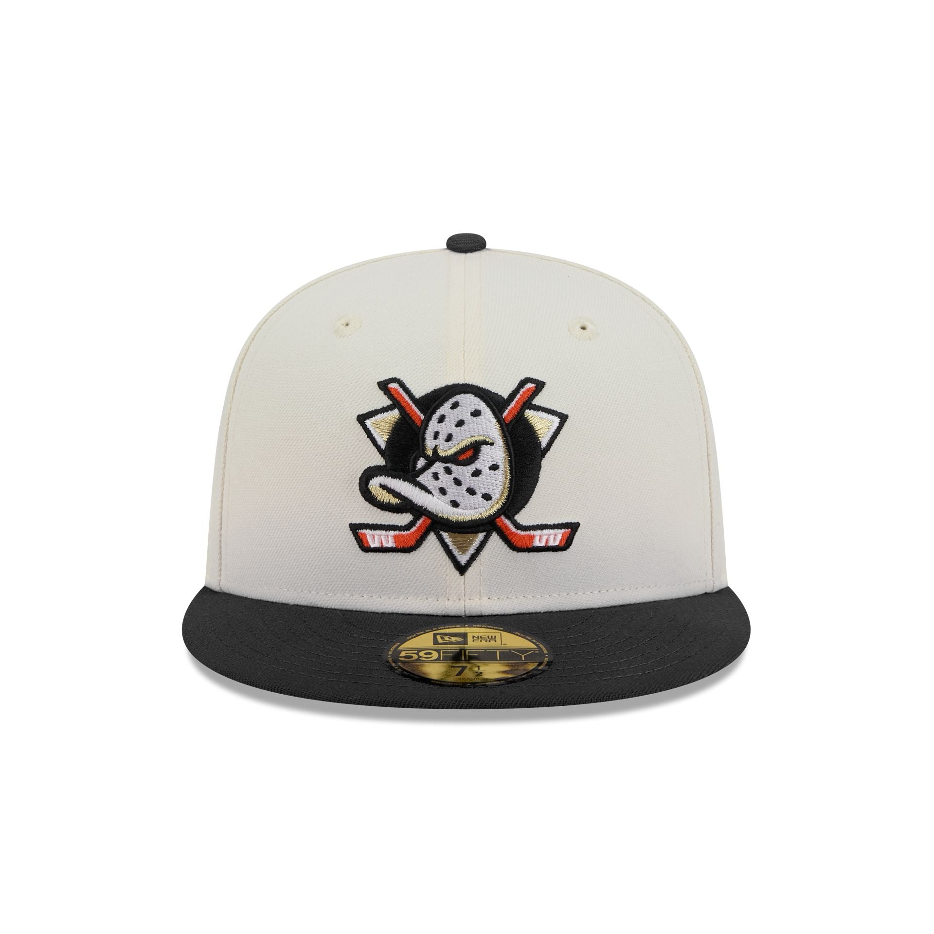 The Anaheim Ducks Chrome White 59FIFTY Fitted Cap features an embroidered Ducks logo at the front panels with a matching NHL Shield at the rear and a gray undervisor.