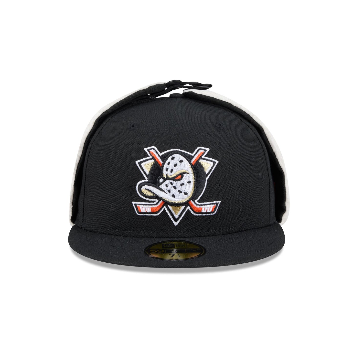 The Anaheim Ducks Classic Dog Ear 59FIFTY Fitted Cap features an embroidered Ducks logo at the front panels with sherpa ear covers with a snap button closure. Additional details include the NHL Shield logo at the rear and a gray undervisor.
