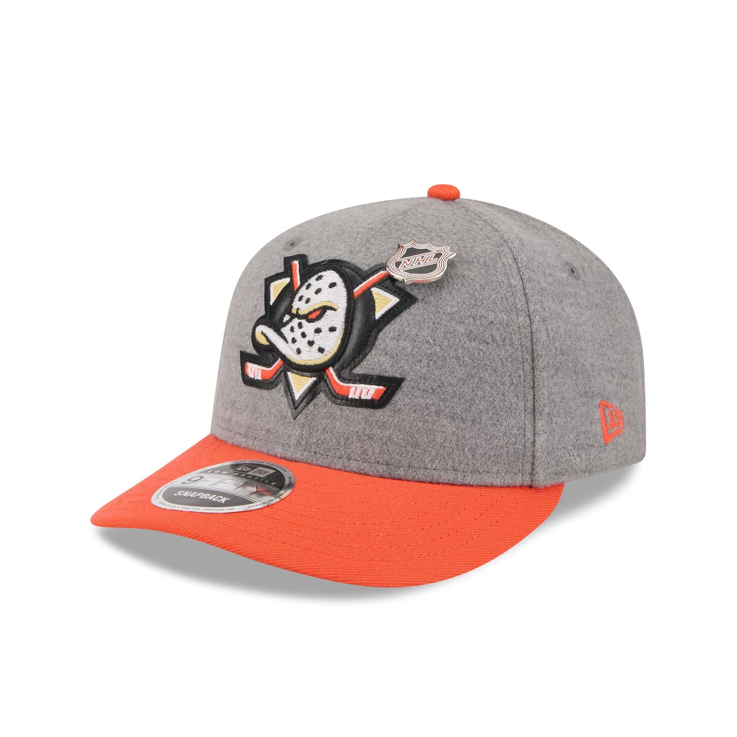 The Anaheim Ducks Heather Gray Wool Low Profile 9FIFTY snapback features a faux leather applique Ducks logo at the front panels against a wool fabrication throughout the cap. Additional details include a conference patch at the right-wear side, an NHL pin at the front, and a script wordmark above an adjustable snapback closure at the rear.