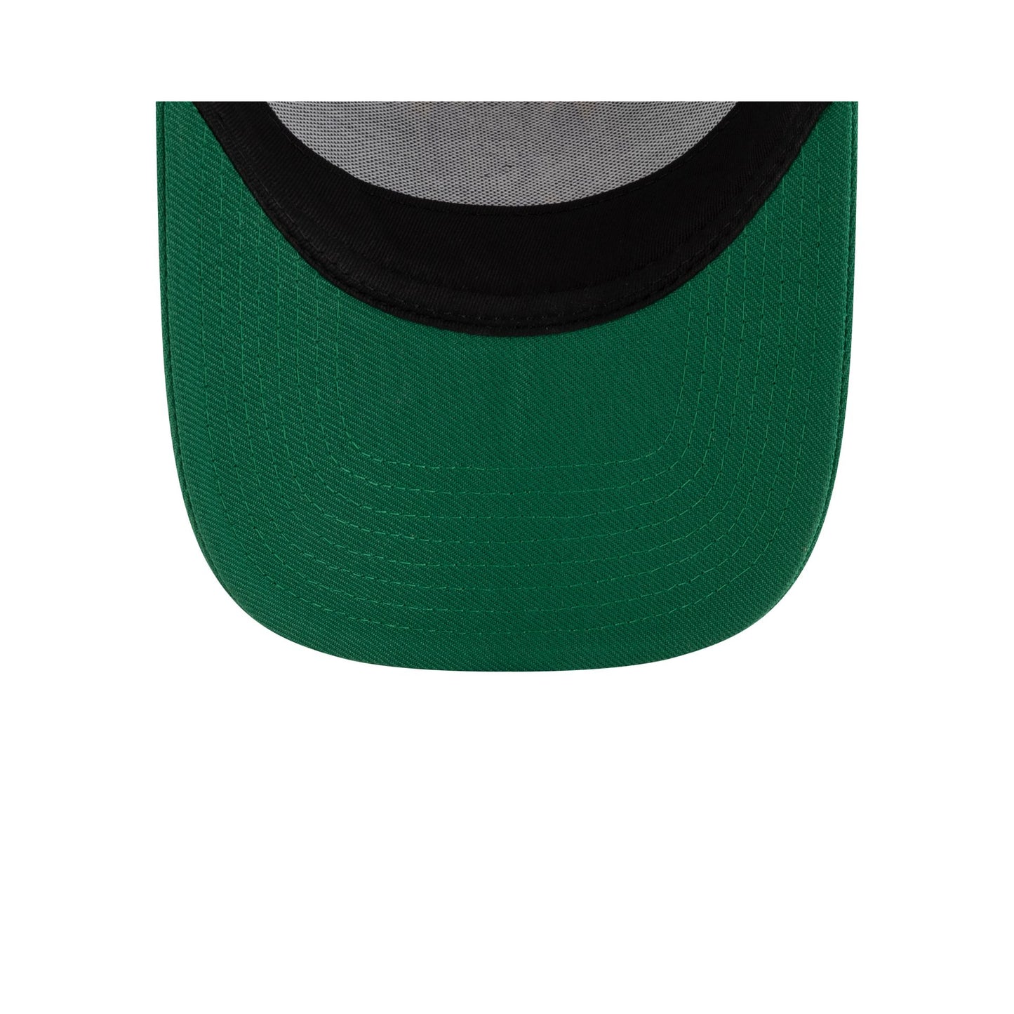 The Anaheim Ducks Kelly Green 9FORTY A-Frame Trucker features an embroidered Ducks logo at the front panels with a matching NHL Shield above a snapback closure at a mesh rear.