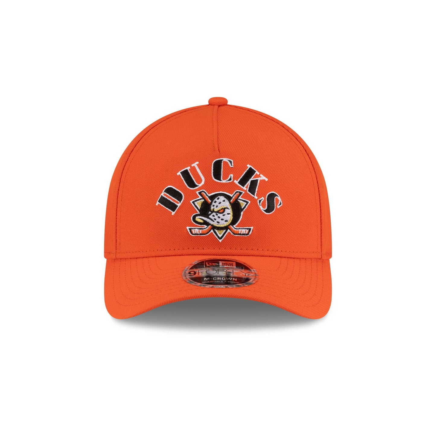 The Anaheim Ducks Retro Arch 9FORTY M-Crown A-Frame Snapback features an embroidered Ducks arched wordmark and logo at the front panels with the NHL Shield above an adjustable snapback closure at the rear and a gray undervisor.