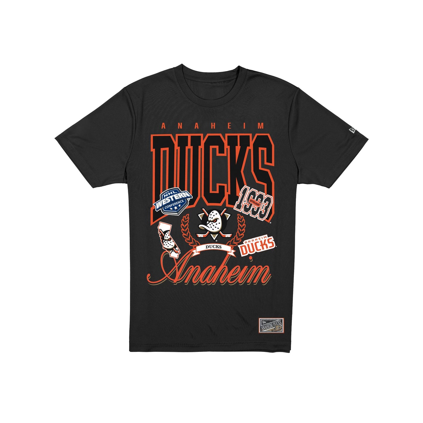 The Anaheim Ducks Sport Classics Vintage Black Oversized T-Shirt features a screen-printed Ducks wordmark and graphic at the front with woven team jocktag at the bottom hem.