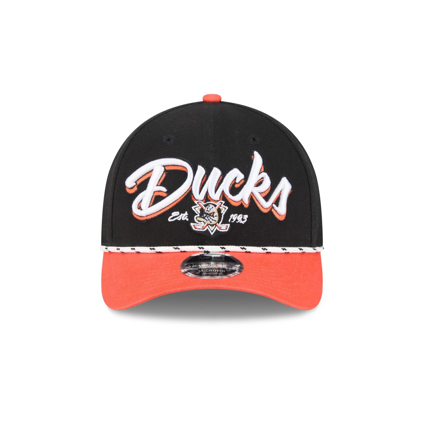 The Anaheim Ducks Team Loyal 9FORTY M-Crown Snapback features an embroidered Ducks wordmark graphic at the front panels with a rope at the visor. Additional details include an adjustable snapback closure at the rear and a gray undervisor.